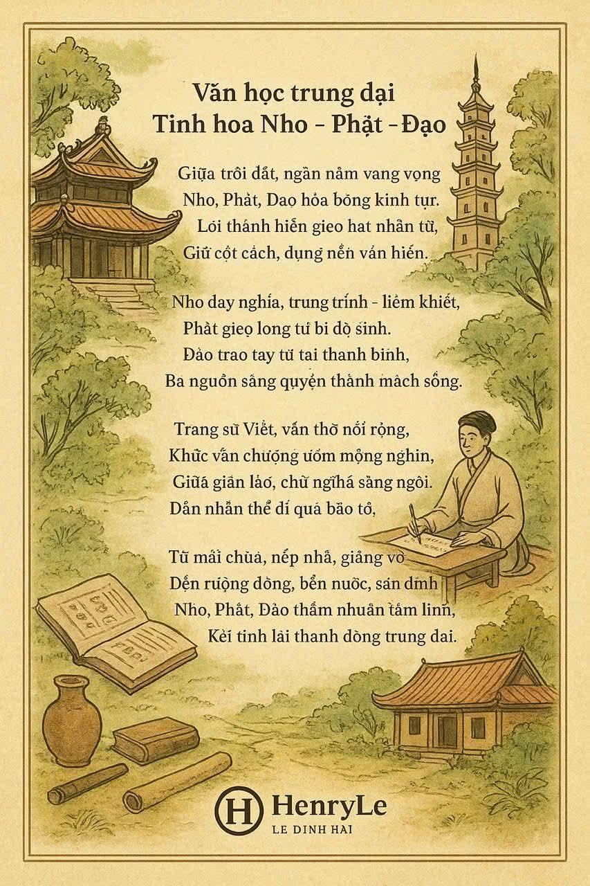 Văn học Việt – ngọc ngà bất tử.HNI 26/10 - B42 📕 BÀI THƠ CHƯƠNG 5 : VĂN HỌC TRUNG ĐẠI – TINH HOA NHO – PHẬT – ĐẠO Giữa trời đất, ngàn năm vang vọng, Nho, Phật, Đạo hòa bóng kinh thư. Lời thánh hiền gieo hạt nhân từ, Giữ cốt cách, dựng nền văn hiến. Nho dạy nghĩa, trung trinh – liêm khiết, Phật gieo lòng từ bi độ sinh. Đạo trao tay tự tại thanh bình, Ba nguồn sáng quyện thành mạch sống. Trang sử Việt, vần thơ nối rộng, Khúc văn chương ươm mộng nghìn đời. Giữa gian lao, chữ nghĩa sáng ngời, Dẫn nhân thế đi qua bão tố. Từ mái chùa, nếp nhà, giảng võ, Đến ruộng đồng, bến nước, sân đình. Nho, Phật, Đạo thấm nhuần tâm linh, Kết tinh lại thành dòng trung đại. Ơi hồn Việt, trời Nam mãi mãi, Tinh hoa này không phai, chẳng tàn. Nối ngàn sau, rực rỡ ánh vàng, Văn học Việt – ngọc ngà bất tử.0 Comments 0 Shares