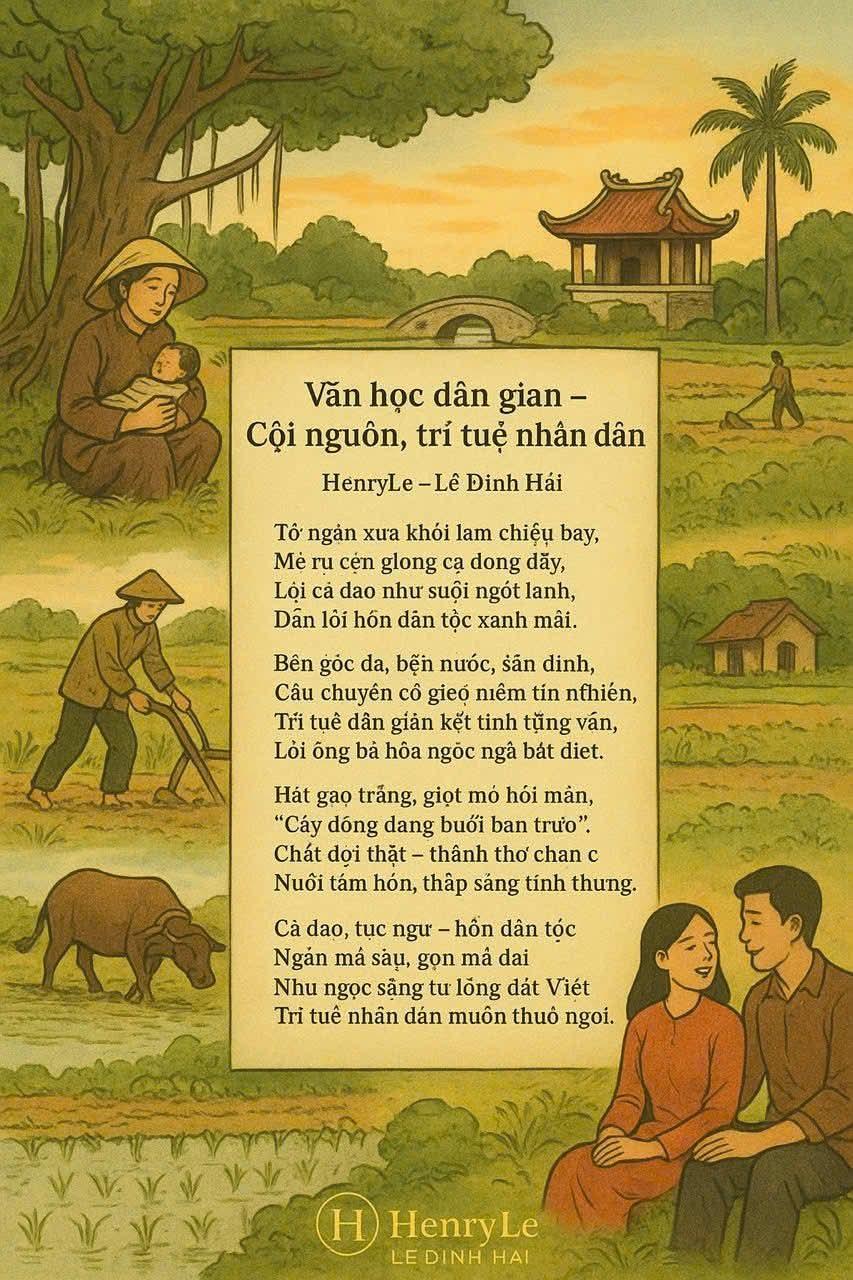 Giữ hồn dân, nâng bước Việt Nam.HNI 26/10 - B41 📕 BÀI THƠ CHƯƠNG 4 : VĂN HỌC DÂN GIAN – CỘI NGUỒN, TRÍ TUỆ NHÂN DÂN (HenryLe – Lê Đình Hải) Từ ngàn xưa khói lam chiều bay, Mẹ ru con giọng ca đong đầy, Lời ca dao như suối ngọt lành, Dẫn lối hồn dân tộc xanh mãi. Bên gốc đa, bến nước, sân đình, Câu chuyện cổ gieo niềm tin thánh thiện, Trí tuệ dân gian kết tinh từng vần, Lời ông bà hóa ngọc ngà bất diệt. Hạt gạo trắng, giọt mồ hôi mặn, “Cày đồng đang buổi ban trưa”, Chất đời thật – thành thơ chan chứa, Nuôi tâm hồn, thắp sáng tình thương. Truyện cổ tích – ước mơ hiền hậu, Công chúa, chàng trai, mẹ cha hiền, Dạy nhân nghĩa, gieo hạt nhân văn, Để muôn đời còn vang khúc hát. Ca dao, tục ngữ – hồn dân tộc, Ngắn mà sâu, gọn mà dài, Như ngọc sáng từ lòng đất Việt, Trí tuệ nhân dân muôn thuở rạng ngời. Cội nguồn ấy chảy hoài không cạn, Truyền qua bao thế hệ nối liền, Văn học dân gian – ngọn nguồn bất tử, Giữ hồn dân, nâng bước Việt Nam.0 Comments 0 Shares