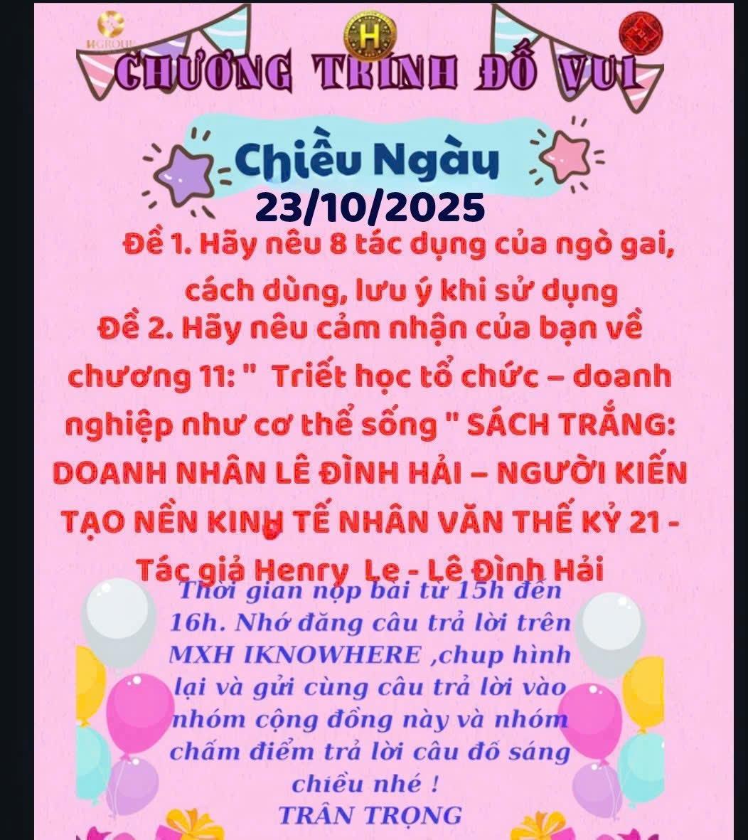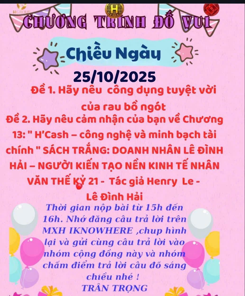 Đó chính là con đường mà doanh nhân Lê Đình Hải lựa chọn – con đường của người kiến tạo, không chỉ kiếm tiền mà còn gieo giá trịHNI 24/10 - CÂU ĐỐ BUỔI CHIỀU 👉🏻Đề 1: 8 công dụng tuyệt vời của cây mía 1. Giải khát và cung cấp năng lượng tự nhiên: Nước mía chứa nhiều đường tự nhiên (sucrose), giúp cơ thể nhanh chóng phục hồi năng lượng, đặc biệt trong những ngày nắng nóng. 2. Thanh nhiệt, giải độc cơ thể: Theo y học cổ truyền, mía có tính mát, giúp làm dịu gan, hỗ trợ thải độc và ngăn ngừa nổi mụn, nhiệt miệng. 3. Tăng cường hệ miễn dịch: Mía chứa nhiều chất chống oxy hóa, vitamin C và khoáng chất giúp nâng cao sức đề kháng, phòng ngừa bệnh tật. 4. Hỗ trợ tiêu hóa tốt: Uống nước mía hoặc nhai mía giúp kích thích tiết nước bọt, hỗ trợ tiêu hóa và giảm chứng ợ nóng, đầy bụng. 5. Tốt cho thận và tiết niệu: Mía có khả năng lợi tiểu tự nhiên, giúp làm sạch đường tiết niệu và giảm nguy cơ sỏi thận. 6. Làm đẹp da, dưỡng ẩm tự nhiên: Nước mía chứa alpha hydroxy acid (AHA) tự nhiên giúp tẩy tế bào chết, dưỡng ẩm và làm sáng da. 7. Hỗ trợ phục hồi sau ốm: Với lượng đường tự nhiên cao và dễ hấp thu, nước mía giúp người bệnh nhanh chóng hồi phục sức khỏe. 8. Tốt cho tim mạch: Mía chứa kali, giúp điều hòa huyết áp, cân bằng điện giải và giảm nguy cơ đột quỵ, bệnh tim. 👉🏻Đề 2: Cảm nhận về chương 12: “Hệ sinh thái H’Max - đầu tư giá trị thực” (Trích từ Sách Trắng: Doanh nhân Lê Đình Hải - Người kiến tạo nền kinh tế nhân văn thế kỷ 21) Chương 12 mang đến cho tôi một góc nhìn sâu sắc về tầm nhìn chiến lược của doanh nhân Lê Đình Hải khi kiến tạo Hệ sinh thái H’Max – một mô hình đầu tư hướng đến giá trị thật, con người thật và sự phát triển bền vững. Điều tôi ấn tượng nhất chính là triết lý “đầu tư không chỉ để sinh lợi, mà để kiến tạo giá trị cho cộng đồng”. H’Max không chỉ là một hệ sinh thái kinh tế, mà còn là một “mảnh đất” nuôi dưỡng nhân tâm, nơi doanh nghiệp, nhà đầu tư và người tiêu dùng cùng chung tay tạo dựng tương lai nhân văn. Chương này giúp tôi hiểu rằng đầu tư giá trị thực không phải là chạy theo lợi nhuận ngắn hạn, mà là xây dựng nền tảng lâu dài dựa trên đạo đức, niềm tin và trách nhiệm xã hội. Đó chính là con đường mà doanh nhân Lê Đình Hải lựa chọn – con đường của người kiến tạo, không chỉ kiếm tiền mà còn gieo giá trị9 Bình luận 0 Chia sẽ