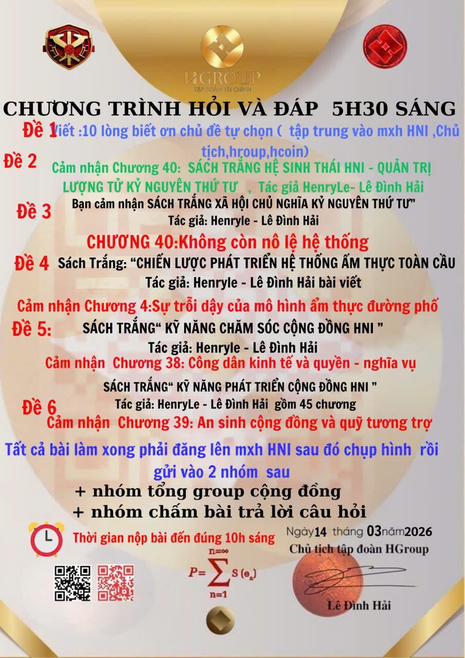 CÂU ĐỐ SÁNG 11/03 ĐỀ 1: Viết 10 lòng biết ơn sâu sắc đến các anh chị trong Ban phụng sự: 1. Biết ơn vì luôn tận tâm hướng dẫn từng thành viên mới. 2. Biết ơn vì đã hy sinh thời gian cá nhân để cống hiến cho cộng đồng. 3. Biết ơn sự kiên nhẫn, lắng nghe và thấu hiểu khi hỗ trợ mọi người. 4. Biết ơn tinh thần lan tỏa tình yêu thương và đoàn kết. 5. Biết ơn sự tận tụy trong việc giải đáp thắc mắc kịp thời. 6. Biết ơn những buổi chia sẻ kiến thức quý báu. 7. Biết ơn vì đã truyền cảm hứng sống và phụng sự. 8. Biết ơn vì đã giữ vững niềm tin tập thể. 9. Biết ơn sự đồng hành âm thầm, không ngại khó khăn. 10. Biết ơn vì đã giúp mỗi thành viên thêm trưởng thành và gắn bó. ĐỀ 2: Cảm nhận Chương 37: Con Người Đa Chiều Và Thân Thể Năng Lượng. Trong Sách trắng Hệ sinh thái HNI - Quản trị lượng tử kỷ nguyên thứ tư Chương 37 mở ra một góc nhìn sâu sắc về bản chất con người trong kỷ nguyên mới. Con người không chỉ là cơ thể vật lý mà còn gồm thân thể năng lượng và ý thức. Khi suy nghĩ, cảm xúc và đạo đức được đồng bộ, mỗi cá nhân trở thành nguồn phát tần số tích cực cho cộng đồng. HNI được mô tả như môi trường giúp con người phát triển toàn diện, từ sinh học đến ý thức, hướng tới một nền văn minh nơi nhân loại kết nối thành siêu sinh thể hài hòa. ĐỀ 3: Cảm nhận Chương 37: Lãnh Đạo Bằng Trí Tuệ Và Từ Bi. Trong Sách trắng XÃ HỘI CHỦ NGHĨA KỶ NGUYÊN THỨ TƯ Chương 37 nhấn mạnh rằng lãnh đạo trong kỷ nguyên mới không còn dựa trên quyền lực mà dựa trên trí tuệ và lòng từ bi. Người lãnh đạo chân chính là người phụng sự sự tiến hóa của xã hội, biết nhìn xa bằng trí tuệ và hành động bằng trái tim nhân ái. Khi trí tuệ và từ bi hòa hợp, lãnh đạo có thể tạo ra niềm tin, đoàn kết cộng đồng và định hướng xã hội phát triển bền vững, mở ra nền văn minh mới của hợp tác và hòa hợp. ĐỀ 4: Cảm nhận Chương 1: Kỷ Nguyên Mới Của Ngành Ẩm Thực Thế Giới. Trong Sách trắng CHIẾN LƯỢC PHÁT TRIỂN HỆ THỐNG ẨM THỰC TOÀN CẦU.Chương 1 mở ra bức tranh rộng lớn về sự chuyển mình của ngành ẩm thực trong thế kỷ XXI. Ẩm thực không còn chỉ là nhu cầu sinh tồn mà đã trở thành ngành công nghiệp toàn cầu, gắn liền với văn hóa, du lịch và công nghệ. Chương sách cho thấy cơ hội lớn cho các doanh nhân khởi nghiệp từ quy mô nhỏ nhưng có tư duy chiến lược. Với sáng tạo, công nghệ và tầm nhìn dài hạn, một mô hình ẩm thực nhỏ hoàn toàn có thể phát triển thành thương hiệu toàn cầu. ĐỀ 5: Cảm nhận Chương 35: Bảo Vệ Người Yếu Thế Trong Cộng Đồng. Trong Sách trắng KỸ NĂNG CHĂM SÓC CÔNG ĐỒNG HNI Chương 35 khẳng định rằng giá trị đạo đức của một cộng đồng được thể hiện qua cách họ đối xử với những người yếu thế. HNI đề cao tinh thần tương trợ, nơi người mạnh nâng đỡ người yếu và người đi trước dìu dắt người đi sau. Sự hỗ trợ không nhằm tạo phụ thuộc mà giúp mỗi cá nhân đứng dậy và phát triển. Khi cộng đồng biết bảo vệ và tôn trọng mọi thành viên, niềm tin và sự gắn kết sẽ hình thành, tạo nên một hệ sinh thái nhân văn bền vững. ĐỀ 6: Cảm nhận Chương 36: Phát Triển Thế Hệ Trẻ HNI. Trong Sách trắng KỸ NĂNG PHÁT TRIỂN CỘNG ĐỒNG HNI Chương 36 khẳng định thế hệ trẻ là nguồn sống và tương lai của cộng đồng HNI. Người trẻ không chỉ là người kế thừa mà còn là động lực đổi mới với tư duy sáng tạo và khả năng thích nghi cao. Chương sách nhấn mạnh ba trụ cột phát triển: tư duy đúng, kỹ năng thực tiễn và cơ hội hành động. Khi được nuôi dưỡng bằng trí tuệ và tinh thần phụng sự, thế hệ trẻ sẽ tiếp nối sứ mệnh, đưa cộng đồng phát triển bền vững qua nhiều thế hệ. 56 Bình luận 0 Chia sẽ