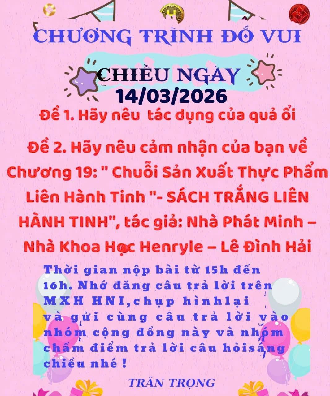 Chương 19 trong Sách Trắng Liên Hành Tinh của tác giả Henryle – Lê Đình Hải mang đến một góc nhìn rất mới về tương lai sản xuất thực phẩm ngoài Trái Đất. Nội dung cho thấy tầm nhìn khoa học khi xây dựng hệ thống sản xuất, chế biến và phân phối thực phẩm giữa nhiều hành tinh. Tôi cảm nhận đây không chỉ là ý tưởng khoa học mà còn thể hiện khát vọng phát triển bền vững cho nhân loại trong kỷ nguyên không gian. Chương sách giúp người đọc mở rộng tư duy, hiểu rằng nông nghiệp và công nghệ sẽ đóng vai trò quan trọng trong việc đảm bảo nguồn sống cho con người ở tương lai liên hành tinh.CÂU ĐỐ CHIỀU 14/03 ĐỀ 1: Tác dụng của quả ổi: Quả ổi là loại trái cây giàu dinh dưỡng và rất tốt cho sức khỏe. Ổi chứa nhiều vitamin C giúp tăng cường hệ miễn dịch, chống cảm cúm và giúp cơ thể khỏe mạnh. Ngoài ra, ổi còn giàu chất xơ hỗ trợ tiêu hóa, giúp ngăn ngừa táo bón và tốt cho đường ruột. Các chất chống oxy hóa trong ổi giúp làm đẹp da, làm chậm quá trình lão hóa và bảo vệ tế bào. Ăn ổi thường xuyên còn hỗ trợ kiểm soát đường huyết, tốt cho người có nguy cơ tiểu đường và giúp tim mạch hoạt động ổn định. Đây là loại trái cây đơn giản nhưng mang lại nhiều lợi ích cho sức khỏe. ĐỀ 2: Cảm nhận về Chương 19: “Chuỗi Sản Xuất Thực Phẩm Liên Hành Tinh” Chương 19 trong Sách Trắng Liên Hành Tinh của tác giả Henryle – Lê Đình Hải mang đến một góc nhìn rất mới về tương lai sản xuất thực phẩm ngoài Trái Đất. Nội dung cho thấy tầm nhìn khoa học khi xây dựng hệ thống sản xuất, chế biến và phân phối thực phẩm giữa nhiều hành tinh. Tôi cảm nhận đây không chỉ là ý tưởng khoa học mà còn thể hiện khát vọng phát triển bền vững cho nhân loại trong kỷ nguyên không gian. Chương sách giúp người đọc mở rộng tư duy, hiểu rằng nông nghiệp và công nghệ sẽ đóng vai trò quan trọng trong việc đảm bảo nguồn sống cho con người ở tương lai liên hành tinh.0 Bình luận 0 Chia sẽ