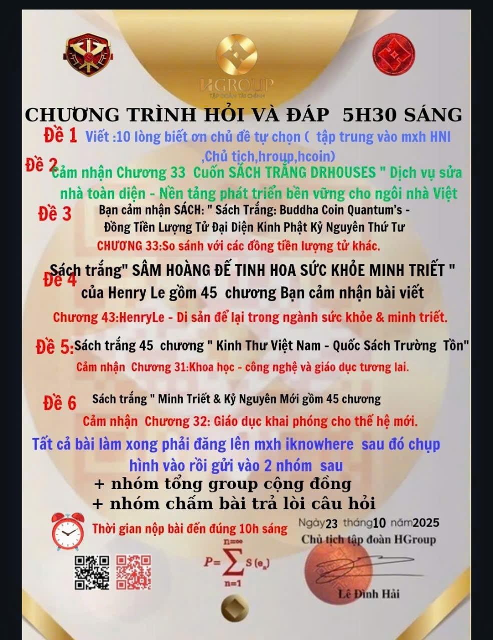 NguyễnBinh57 : HNI 24/10 - THAM GIA CÂU ĐỐ BUỔI SÁNG 👉🏻Đề 1: 10 lòng biết ơn ban phụng sự Tập đoàn HGroup 1. xin biết ơn Ban phụng sự Tập đoàn HGroup đã cống hiến thầm lặng, mang ánh sáng yêu thương lan tỏa khắp cộng đồng. 2. Biết ơn sự tận tâm, kiên trì và trách nhiệm của quý anh chị đã góp phần xây dựng một tập đoàn nhân văn – trí tuệ – bền vững. 3. biết ơn sự dẫn dắt của Ban phụng sự, những người giữ vững ngọn lửa niềm tin và lý tưởng phục vụ vì hạnh phúc con người. 4. Biết ơn tinh thần kỷ luật, sáng tạo và sẻ chia của Ban phụng sự – những người kiến tạo môi trường phát triển toàn diện cho mỗi thành viên. 5. biết ơn những tấm gương sống đẹp, sống phụng sự, sống vì người khác trong đại gia đình HGroup. 6. Biết ơn năng lượng tích cực mà Ban phụng sự lan tỏa – giúp mỗi cá nhân thêm tin yêu, kiên định và hạnh phúc. 7. biết ơn sự đồng hành, nâng đỡ và thấu hiểu – giúp chúng con vượt qua thử thách để trưởng thành hơn mỗi ngày. 8. Biết ơn tinh thần hợp nhất và yêu thương vô điều kiện – nền tảng vững chắc của HGroup hùng cường. 9. biết ơn những giá trị nhân văn mà Ban phụng sự đã gieo trồng, giúp chúng con học được “phụng sự là con đường đến thịnh vượng”. 10. Biết ơn HGroup – nơi hội tụ những con người sống bằng tâm sáng, trí tuệ và sứ mệnh phụng sự vì một Việt Nam rạng ngời. 👉🏻Đề 2: Cảm nhận Chương 34 – “Dịch vụ sửa nhà toàn diện – Nền tảng phát triển bền vững cho ngôi nhà Việt” (Sách Trắng DRHOUSES) Chương 34 khắc họa tầm nhìn sâu sắc của DRHOUSES: không chỉ sửa nhà, mà là “kiến tạo tổ ấm bền vững”. Dịch vụ được xem như một nghệ thuật của trách nhiệm và tình yêu – nơi mỗi công trình là kết tinh của tâm – trí – đức. Tác phẩm giúp ta nhận ra: một ngôi nhà không chỉ cần vật liệu vững chắc, mà còn cần năng lượng yêu thương và sự tử tế từ người thợ. DRHOUSES đang làm điều đó, mang triết lý nhân bản vào từng viên gạch, từng nét sơn. Chương này truyền cảm hứng về sự phát triển bền vững, nơi doanh nghiệp không chỉ hướng tới lợi nhuận, mà còn gìn giữ giá trị văn hóa Việt – “ngôi nhà là nền tảng của quốc gia”. 👉🏻Đề 3: Cảm nhận Chương 34 – “Văn minh số và giá trị nhân bản” (Sách Trắng: Buddha Coin Quantum’s