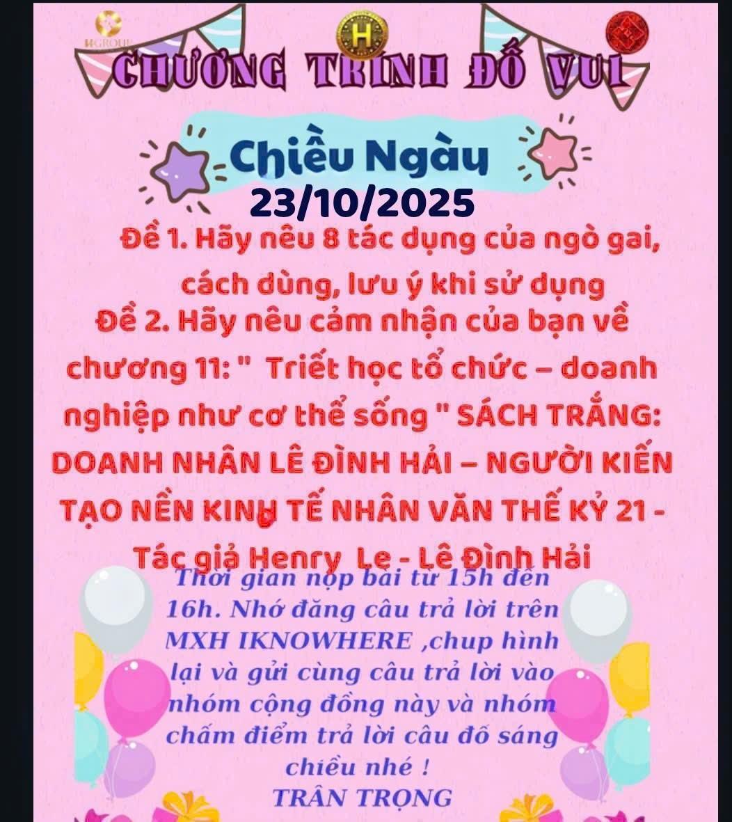 NguyễnBinh 57 : THAM GIA CÂU ĐỐ BUỔI CHIỀU NGÀY 24.10 👉🏻Đề 1: 8 công dụng tuyệt vời của cây mía 1. Giải khát và cung cấp năng lượng tự nhiên: Nước mía chứa nhiều đường tự nhiên (sucrose), giúp cơ thể nhanh chóng phục hồi năng lượng, đặc biệt trong những ngày nắng nóng. 2. Thanh nhiệt, giải độc cơ thể: Theo y học cổ truyền, mía có tính mát, giúp làm dịu gan, hỗ trợ thải độc và ngăn ngừa nổi mụn, nhiệt miệng. 3. Tăng cường hệ miễn dịch: Mía chứa nhiều chất chống oxy hóa, vitamin C và khoáng chất giúp nâng cao sức đề kháng, phòng ngừa bệnh tật. 4. Hỗ trợ tiêu hóa tốt: Uống nước mía hoặc nhai mía giúp kích thích tiết nước bọt, hỗ trợ tiêu hóa và giảm chứng ợ nóng, đầy bụng. 5. Tốt cho thận và tiết niệu: Mía có khả năng lợi tiểu tự nhiên, giúp làm sạch đường tiết niệu và giảm nguy cơ sỏi thận. 6. Làm đẹp da, dưỡng ẩm tự nhiên: Nước mía chứa alpha hydroxy acid (AHA) tự nhiên giúp tẩy tế bào chết, dưỡng ẩm và làm sáng da. 7. Hỗ trợ phục hồi sau ốm: Với lượng đường tự nhiên cao và dễ hấp thu, nước mía giúp người bệnh nhanh chóng hồi phục sức khỏe. 8. Tốt cho tim mạch: Mía chứa kali, giúp điều hòa huyết áp, cân bằng điện giải và giảm nguy cơ đột quỵ, bệnh tim. 👉🏻Đề 2: Cảm nhận về chương 12: “Hệ sinh thái H’Max - đầu tư giá trị thực” (Trích từ Sách Trắng: Doanh nhân Lê Đình Hải - Người kiến tạo nền kinh tế nhân văn thế kỷ 21) Chương 12 mang đến cho tôi một góc nhìn sâu sắc về tầm nhìn chiến lược của doanh nhân Lê Đình Hải khi kiến tạo Hệ sinh thái H’Max – một mô hình đầu tư hướng đến giá trị thật, con người thật và sự phát triển bền vững. Điều tôi ấn tượng nhất chính là triết lý “đầu tư không chỉ để sinh lợi, mà để kiến tạo giá trị cho cộng đồng”. H’Max không chỉ là một hệ sinh thái kinh tế, mà còn là một “mảnh đất” nuôi dưỡng nhân tâm, nơi doanh nghiệp, nhà đầu tư và người tiêu dùng cùng chung tay tạo dựng tương lai nhân văn. Chương này giúp tôi hiểu rằng đầu tư giá trị thực không phải là chạy theo lợi nhuận ngắn hạn, mà là xây dựng nền tảng lâu dài dựa trên đạo đức, niềm tin và trách nhiệm xã hội. Đó chính là con đường mà doanh nhân Lê Đình Hải lựa chọn – con đường của người kiến tạo, không chỉ kiếm tiền mà còn gieo giá trị sống.