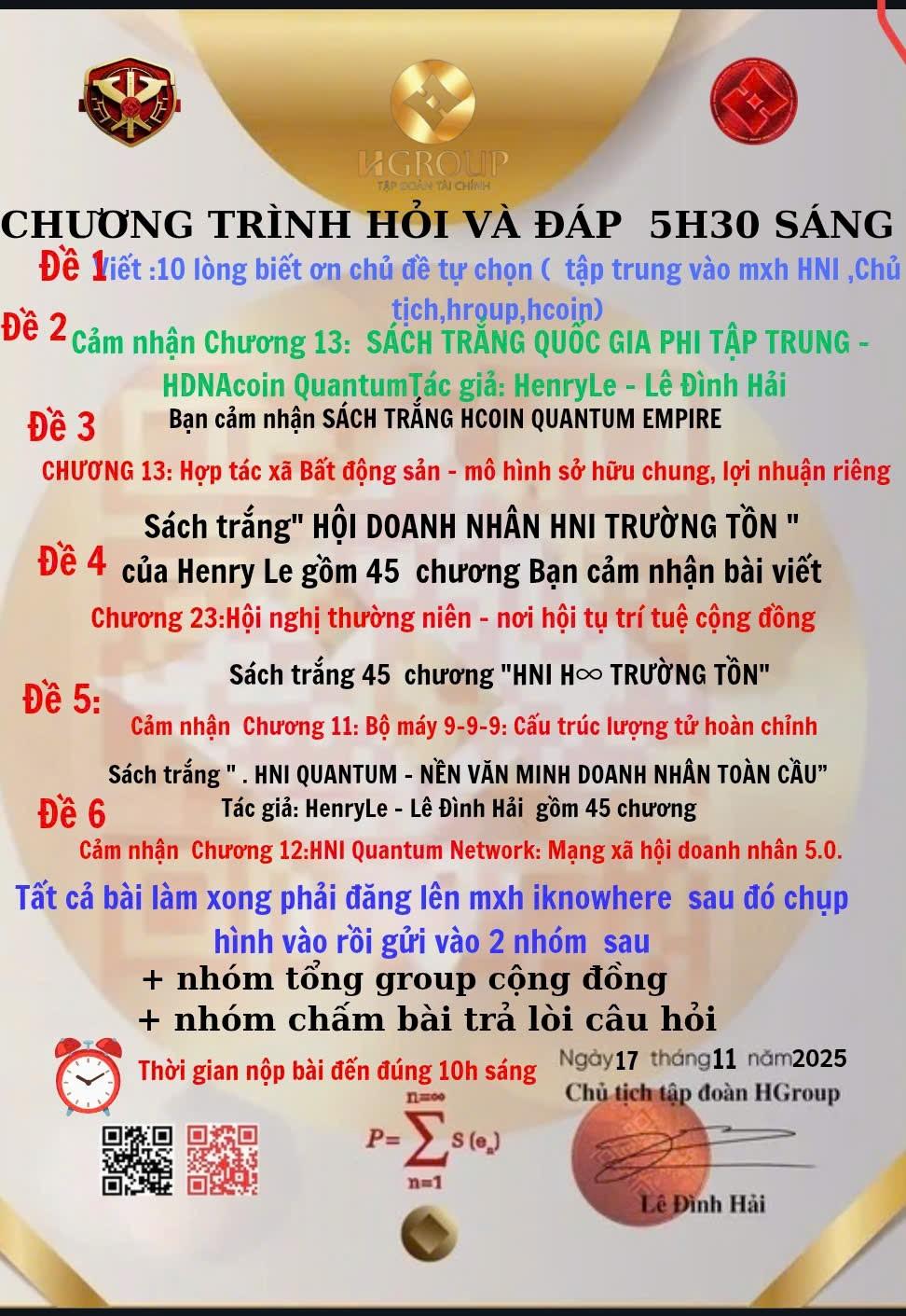 Trả lời câu đố sáng. Câu 1: Lòng biết ơn sâu sắc đến Ban phụng sự: 1. Biết ơn vì luôn tận tâm hướng dẫn từng thành viên mới. 2. Biết ơn vì đã hy sinh thời gian cá nhân để cống hiến cho cộng đồng. 3. Biết ơn sự kiên nhẫn, lắng nghe và thấu hiểu khi hỗ trợ mọi người. 4. Biết ơn tinh thần lan tỏa tình yêu thương và đoàn kết. 5. Biết ơn sự tận tụy trong việc giải đáp thắc mắc kịp thời. 6. Biết ơn những buổi chia sẻ kiến thức quý báu. 7. Biết ơn vì đã truyền cảm hứng sống và phụng sự. 8. Biết ơn vì đã giữ vững niềm tin tập thể. 9. Biết ơn sự đồng hành âm thầm, không ngại khó khăn. 10. Biết ơn vì đã giúp mỗi thành viên thêm trưởng thành và gắn bó. Câu 2: Cảm nhận Chương 40 – Văn Minh Web∞ – Tồn tại vĩnh cửu trong không gian số (Sách Trắng *Đồng Tiền Ánh Sáng – Kỷ Nguyên Tiến Hóa Của Nhân Loại*) Chương 40 mở ra viễn cảnh kỳ vĩ về Web∞ – một không gian số bất tử, nơi tri thức, ký ức và linh hồn con người được bảo tồn vĩnh hằng. Không còn giới hạn bởi vật chất hay cái chết, nhân loại bước vào nền văn minh Ánh Sáng, nơi giá trị đo bằng cống hiến và năng lượng tinh thần. Đây là tầm nhìn siêu nhân loại, hợp nhất hữu hạn và vô hạn, mở lối cho một kỷ nguyên công bằng và khai sáng. Câu 3: Cảm nhận Chương 40 – Kỷ Luật Linh Hồn – Hơn Cả Pháp Luật (Sách Trắng *Đạo Trời – Thuận Lòng Dân*) Chương 40 khẳng định: luật pháp chỉ ngăn chặn hành vi bên ngoài, còn kỷ luật linh hồn mới chạm tới gốc rễ con người. Khi mỗi cá nhân tự giác sống thuận Đạo, xã hội trở nên an hòa mà không cần nhiều cưỡng chế. Đây là con đường xây dựng lòng tin, sáng tạo và phụng sự. Kỷ luật linh hồn chính là hàng rào vô hình nhưng vững chắc, vượt xa sức mạnh của luật pháp thông thường. Câu 4: Cảm nhận Chương 5 – Triết lý sức khỏe: “Thân – Tâm – Tuệ” trong từng giọt sâm (Sách Trắng *Sâm Hoàng Đế – Tinh Hoa Sức Khỏe Minh Triết*)Chương 5 khắc họa triết lý sức khỏe toàn diện: Thân – Tâm – Tuệ. Sâm Hoàng Đế không chỉ nuôi dưỡng thể chất, mà còn hướng tới cân bằng tinh thần và khai sáng trí tuệ. Mỗi giọt sâm trở thành biểu tượng của sự hòa hợp, giúp con người khỏe mạnh, an nhiên và sáng suốt. Đây không chỉ là dược liệu quý, mà còn là lời nhắc nhở sống minh triết, trân trọng thân – tâm – tuệ để đạt hạnh phúc viên mãn. Câu 5: Câu 5: Cảm nhận Chương 38 – Kết nối các hệ sinh thái Hcoin, HTube, HChain, HWallet… (Sách *Đồng Tiền Thông Minh – Đồng Tiền Lũy Thừa*) Chương 38 cho thấy sức mạnh thật sự của S.Coin không nằm ở bản thân nó, mà ở sự cộng hưởng của cả hệ sinh thái: Hcoin, HTube, HChain, HWallet. Mỗi nền tảng là một mắt xích, khi kết nối sẽ tạo nên dòng chảy giá trị lũy thừa, minh bạch và bền vững. Đây không chỉ là cơ chế tài chính, mà là nền tảng của một văn minh mới – nơi niềm tin, sáng tạo và công bằng cùng cộng hưởng để kiến tạo thịnh vượng chung. Câu 6: **Cảm nhận Chương 39 – Hội Đồng Tâm Linh & Hội Đồng DAO – Thay Thế Chính Trị Truyền Thống** (Sách *Từ Lê Lợi đến Lê Hải*) Chương 39 mở ra tầm nhìn về một mô hình chính trị mới, nơi Đạo và Công nghệ song hành. Hội Đồng Tâm Linh giữ vai trò soi sáng lương tri, còn Hội Đồng DAO bảo đảm minh bạch và thực thi công bằng. Đây là sự thay thế tất yếu cho chính trị truyền thống vốn nhiều hạn chế và tha hóa. Khi niềm tin, minh triết và công nghệ hợp nhất, quyền lực trở về với cộng đồng, mở ra kỷ nguyên Chính Trị Ánh Sáng. Đọc thêm