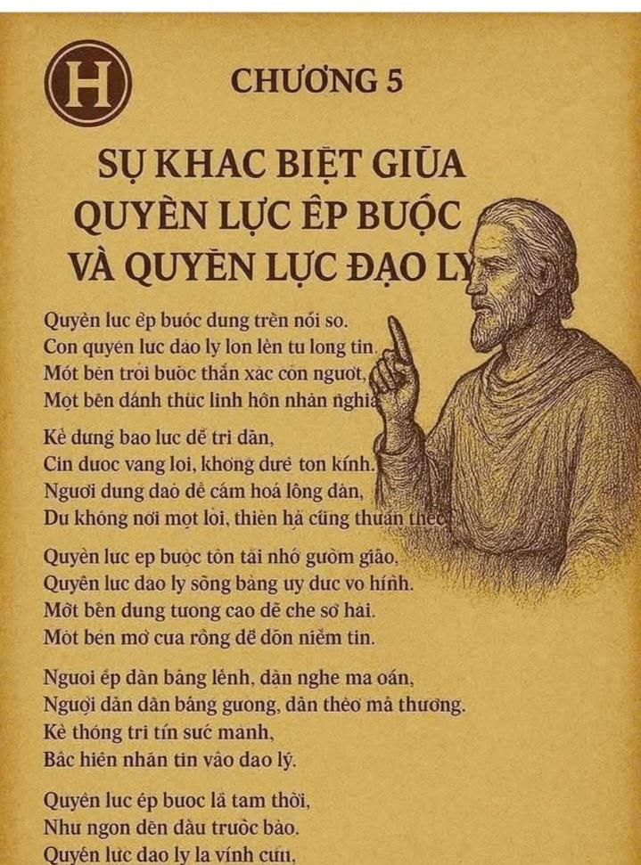 HNI 28-10 BÀI THƠ CHƯƠNG 5 : SỰ KHÁC BIỆT GIỮA QUYỀN LỰC ÉP BUỘC VÀ QUYỀN LỰC ĐẠO LÝ Quyền lực ép buộc dựng trên nỗi sợ, Còn quyền lực đạo lý lớn lên từ lòng tin. Một bên trói buộc thân xác con người, Một bên đánh thức linh hồn nhân nghĩa. Kẻ dùng bạo lực để trị dân, Chỉ được vâng lời, không được tôn kính. Người dùng đạo để cảm hóa lòng dân, Dù không nói một lời, thiên hạ cũng thuận theo. Ép buộc khiến người cúi đầu ngoài mặt, Nhưng trong tim vẫn giữ ngọn lửa phản kháng. Đạo lý khiến người cúi đầu tự nguyện, Bởi thấy trong đó ánh sáng của công tâm. Quyền lực ép buộc tồn tại nhờ gươm giáo, Quyền lực đạo lý sống bằng uy đức vô hình. Một bên dựng tường cao để che sợ hãi, Một bên mở cửa rộng để đón niềm tin. Người ép dân bằng lệnh, dân nghe mà oán, Người dẫn dân bằng gương, dân theo mà thương. Kẻ thống trị tin sức mạnh, Bậc hiền nhân tin vào đạo lý. Ép buộc khiến xã hội im lặng, Đạo lý khiến xã hội an hòa. Im lặng là bóng tối của sợ hãi, An hòa là ánh sáng của trí minh. Quyền lực ép buộc là tạm thời, Như ngọn đèn dầu trước bão. Quyền lực đạo lý là vĩnh cửu, Như mặt trời soi khắp muôn phương. Khi người cầm quyền hiểu rằng đạo đức là sức mạnh, Thì họ không cần vũ lực để giữ ngai vàng. Khi người cầm quyền dựa vào sợ hãi, Thì Trời đã ghi tên họ trong sổ phạt. Bởi Trời không trao quyền cho kẻ cưỡng ép, Trời chỉ ban mệnh cho người thuận Đạo. Ép buộc khiến quyền tan như cát bụi, Đạo lý khiến quyền sáng như sao trời. Hỡi kẻ đang nắm quyền, hãy tự hỏi lòng mình: Ngươi khiến dân sợ, hay khiến dân kính? Bởi câu trả lời ấy – Sẽ định đoạt ngươi thuộc về Đạo Trời hay Đạo diệt.