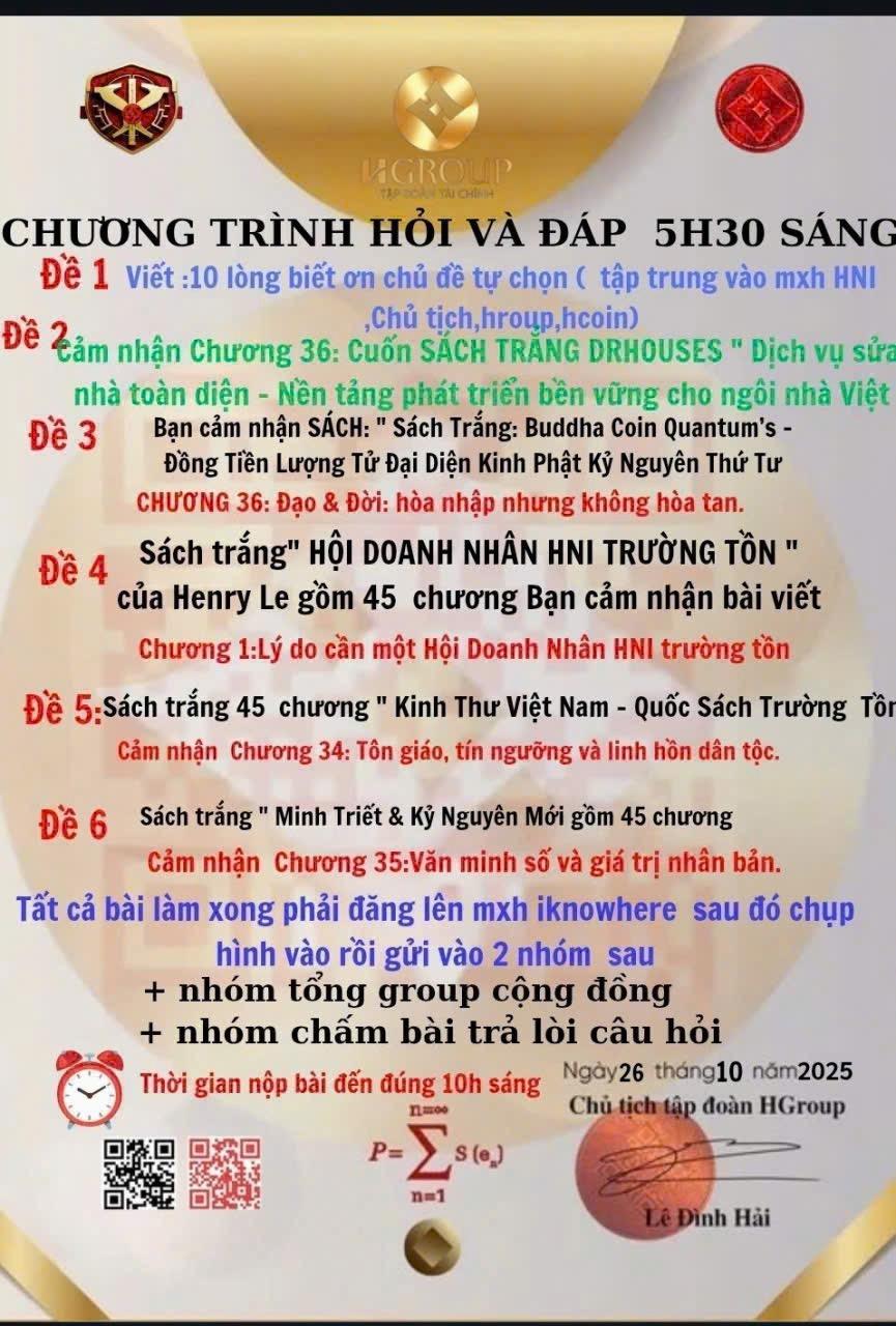 Đạo tâm: người được chọn phải có tâm sáng, không vì tư lợi mà hành động, luôn hướng tới lợi ích chung của muôn dân.HNI 27/10: 💎PHẦN III: MINH QUÂN – MINH CHỦ – MINH TRỊ 🌺CHƯƠNG 21: MINH QUÂN LÀ AI – NGƯỜI ĐẠI DIỆN CHO THIÊN Ý I. Khởi đầu của một kỷ nguyên minh triết Từ thuở hồng hoang, con người vẫn luôn khao khát một vị lãnh đạo sáng suốt — người vừa hiểu lòng dân, vừa thuận ý Trời. Mọi triều đại huy hoàng trong lịch sử đều mở đầu bằng sự xuất hiện của một “minh quân” – người có khả năng lắng nghe không chỉ tiếng nói của nhân dân, mà còn cả tiếng vọng vô hình của Thiên mệnh. “Minh quân” không phải là kẻ ngồi trên ngai vàng, mà là người biết vì dân mà trị, lấy Đạo mà dẫn, lấy đức mà giữ thiên hạ. Bởi nếu chỉ có quyền mà không có Đạo, thì quyền ấy chỉ là bóng đèn cháy rực trong chốc lát, rồi vụt tắt trong tăm tối. Còn minh quân, chính là người soi sáng nhân tâm bằng chính ánh sáng trong tâm mình. Thế giới hôm nay – dù không còn vua chúa – vẫn cần những minh quân mới, những người biết lãnh đạo bằng trí tuệ và lòng nhân, biết đặt mình trong dòng chảy Thiên Đạo để dẫn dắt nhân loại bước vào thời đại mới – thời đại của ý Trời, lòng Dân và trí Tuệ hợp nhất. II. Thiên ý – nguồn gốc tối cao của quyền lực Muốn hiểu minh quân là ai, trước hết phải hiểu Thiên ý là gì. Từ xưa, các bậc hiền triết Đông – Tây đều nói: “Trời sinh ra người, nhưng cũng đặt trong lòng người hạt mầm của Đạo.” Thiên ý không phải là ý chí của một đấng vô hình ở xa xôi, mà là trật tự tự nhiên của vũ trụ – nơi mà công lý, đạo đức và nhân tâm hòa làm một. Trong “Đạo Đức Kinh”, Lão Tử viết: “Người thuận Đạo thì Đạo ở cùng người. Kẻ nghịch Đạo thì Đạo rời bỏ hắn.” Thiên ý chính là Đạo vận hành trong trật tự nhân sinh. Một nhà lãnh đạo muốn trở thành minh quân thì không thể dựa vào sức mạnh hay mưu kế, mà phải thấu hiểu quy luật của Trời – Đất – Người. Trời trao quyền cho ai, không phải qua nghi lễ hay ngai vàng, mà qua sự đồng thuận sâu thẳm trong lòng dân chúng. Thiên ý thể hiện qua: Dân ý: khi lòng dân hướng về một người, đó là dấu hiệu Trời đang thử trao sứ mệnh cho người ấy. Thiên thời: khi thời đại cần một hướng đi mới, Trời sẽ chọn người đủ tầm để mở lối. Đạo tâm: người được chọn phải có tâm sáng, không vì tư lợi mà hành động, luôn hướng tới lợi ích chung của muôn dân.0 Comments 0 Shares - CÂU ĐỐ SÁNG 26/10