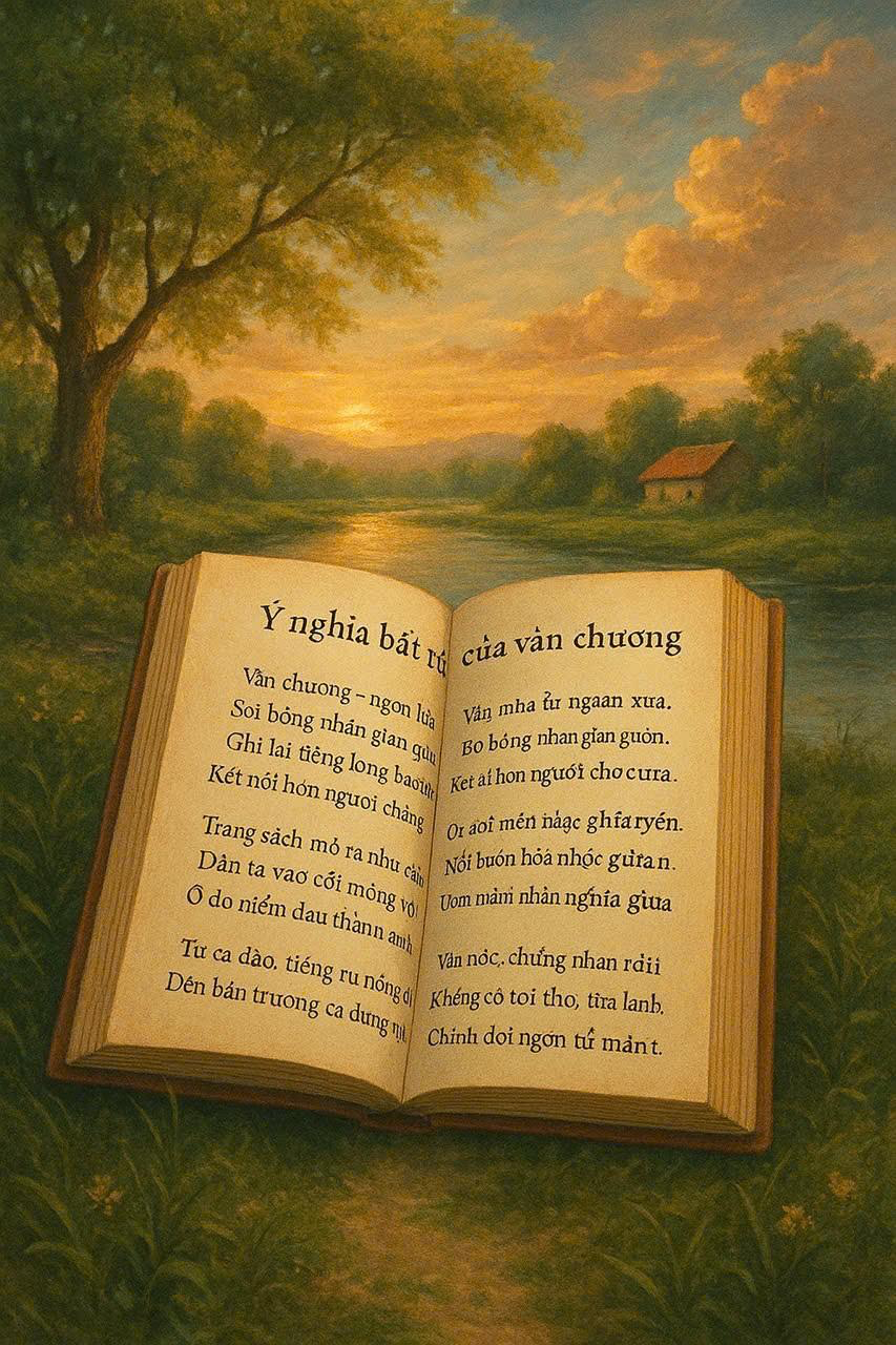 HNI 26/10 - BÀI THƠ CHƯƠNG 1 : Ý NGHĨA BẤT TỬ CỦA VĂN CHƯƠNG Văn chương – ngọn lửa từ ngàn xưa, Soi bóng nhân gian giữa nắng mưa. Ghi lại tiếng lòng bao thế hệ, Kết nối hồn người chẳng xóa nhòa. Trang sách mở ra như cánh cửa, Dẫn ta vào cõi mộng vô biên. Ở đó niềm đau thành ánh sáng, Nỗi buồn hóa nhạc giữa bình yên. Từ ca dao, tiếng ru nồng thuở nhỏ, Đến bản trường ca dựng nước ngàn năm. Từng chữ gieo hồn như hạt giống, Ươm mầm nhân nghĩa giữa trần gian. Văn học – chứng nhân bao đổi thay, Ngẩng đầu giữa gió bụi tháng ngày. Khi con người còn khát khao sống, Thì văn chương còn bất tử nơi đây. Không có văn chương, đời khô cạn, Không có lời thơ, tim lạnh lùng. Chính bởi ngôn từ mà nhân loại, Biết yêu, biết khóc, biết anh hùng. Ôi, sức mạnh lặng thầm bất tử, Khắc trên giấy trắng dấu chân người. Văn học chẳng già, không chết, Mà hóa thành vĩnh viễn muôn đời. Đọc ít hơn