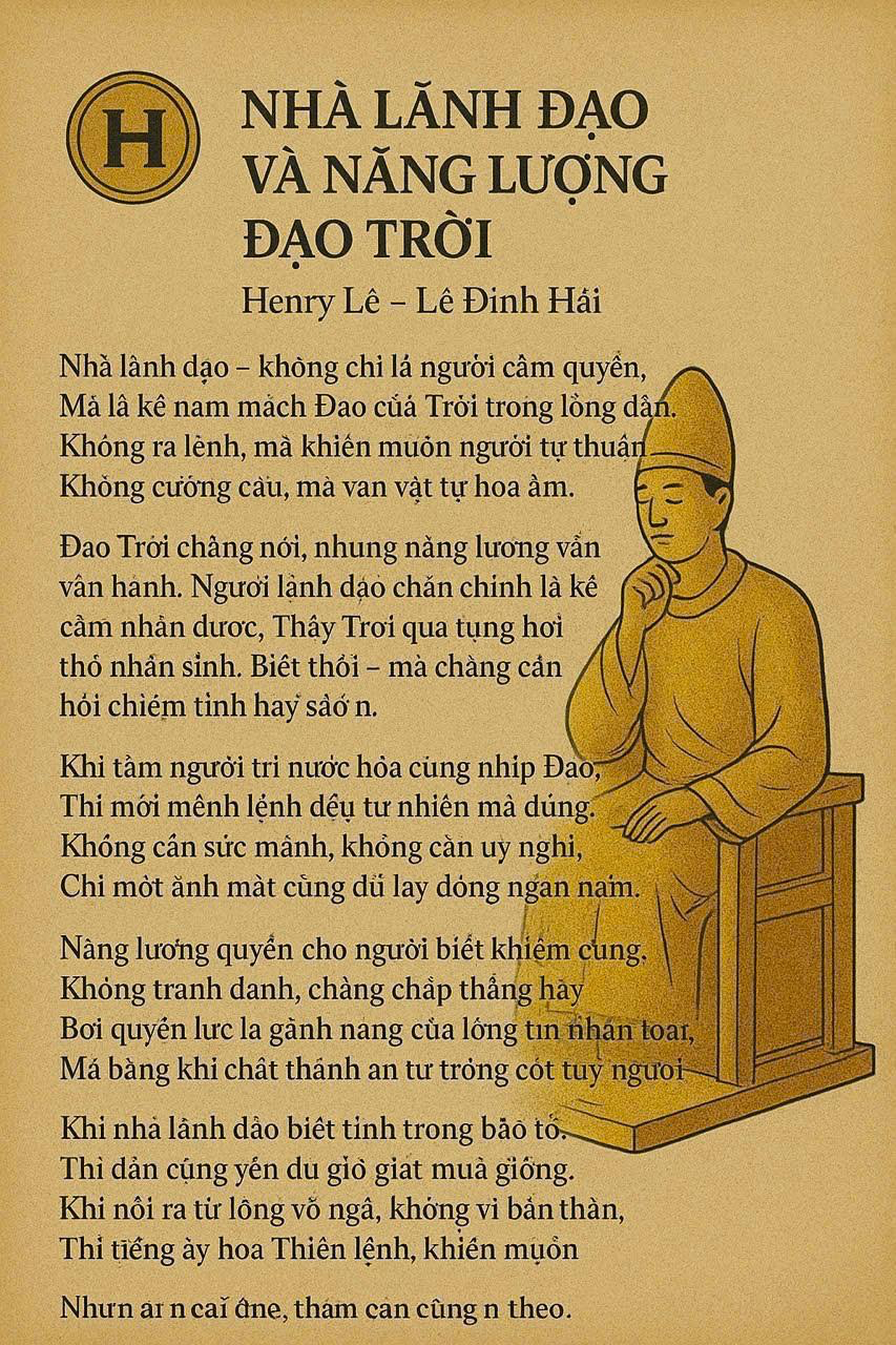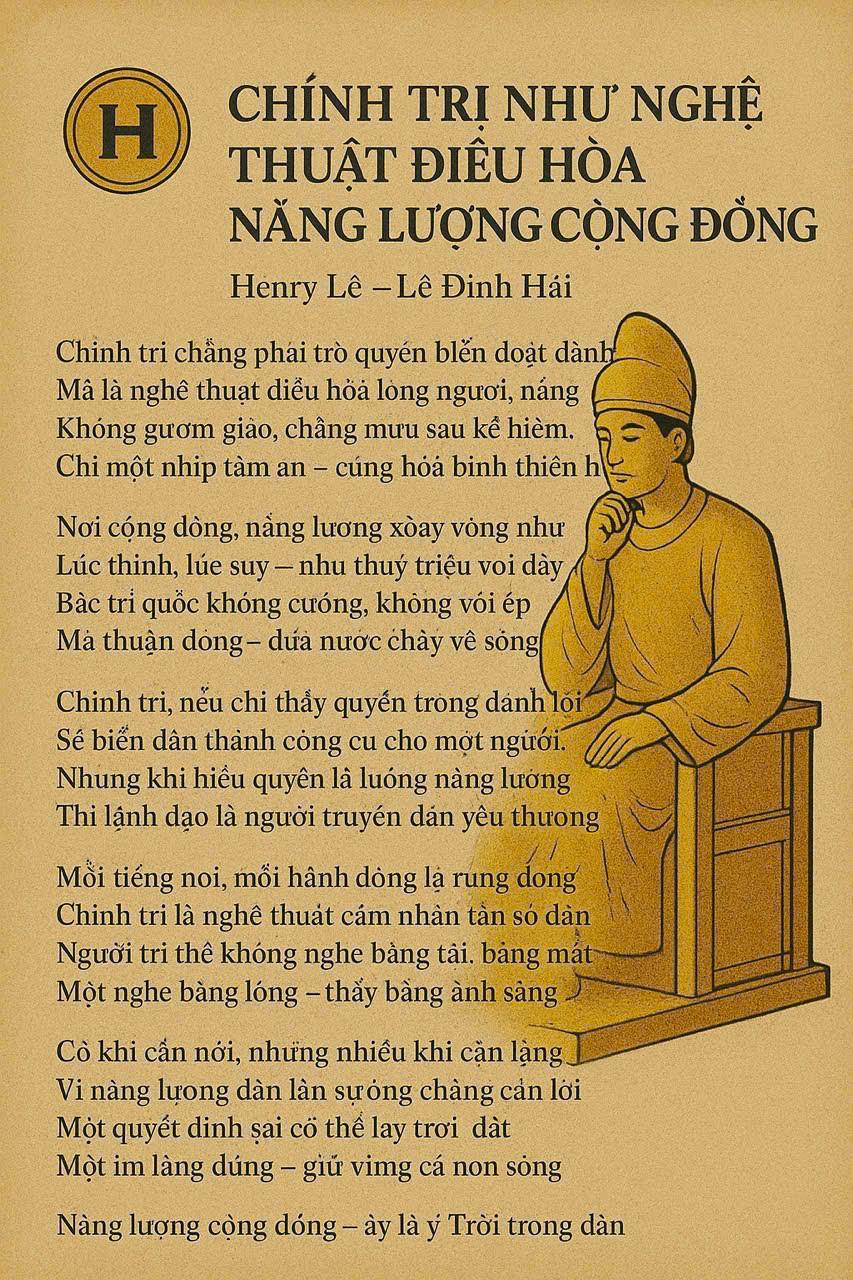 HNI 27/10: Bài thơ chương 7: BÀI THƠ: THIÊN Ý VÀ LÒNG DÂN – HAI CHIỀU THỐNG NHẤT TRONG CHÍNH TRỊ Tác giả: Henry Lê – Lê Đình Hải Trời chẳng nói, nhưng lòng dân là tiếng, Nghe dân kêu, ấy chính tiếng của Trời. Thiên ý chẳng xa, chẳng ẩn nơi mây trắng, Mà hiện trong từng nhịp thở của nhân gian. Khi dân an, Trời cũng mỉm cười hiền hậu, Khi dân khổ, Trời nghiêng lệ xuống nhân gian. Người cầm quyền nếu trái lòng dân, Tức nghịch Trời – muôn loài đều phản lại. Thiên ý và lòng dân, hai mà một, Như Trời cùng Đất hòa hợp thành sinh khí. Dân thuận thì nước yên, đạo sáng, Dân oán thì Trời cũng chẳng bênh ai. Bậc minh quân biết lắng nghe điều nhỏ, Một tiếng thở than cũng xem như mệnh Trời. Không dùng gươm, chẳng cần mưu, chẳng cần trị, Chỉ thuận lòng dân – vạn sự hóa an nhiên. Kẻ ngu quyền tưởng Trời xa vời vợi, Không hay Trời ẩn ngay trong mắt dân. Một ánh nhìn, một giọt lệ, một niềm tin, Là thước đo cho đạo lý của quyền lực. Khi Trời ban mệnh không phải ban ngai, Mà ban trọng trách gìn giữ lòng nhân ái. Khi dân trao niềm tin không phải vì sợ, Mà vì thấy đạo trong tâm người lãnh đạo. Thiên ý chẳng nằm trong lễ nghi cung kính, Mà trong cách quan nhìn dân bằng đôi mắt thật. Một lời chân hơn vạn điều sắc dụ, Một nghĩa tình hơn trăm đạo chiếu ban. Khi Trời muốn chuyển, dân trước khẽ động, Như sóng ngầm báo hiệu cơn phong ba. Bậc hiểu Đạo biết nhìn trong tĩnh lặng, Để sửa mình, chứ chẳng trách Trời cao. Ngôi vua giữ được không nhờ gươm sắc, Mà nhờ lòng dân kết lại thành tường đồng. Khi Trời và dân cùng hướng một phương, Thì nước vững – dù muôn cơn giông tố. Kết: Thiên ý và lòng dân – hai chiều cùng một Đạo, Trời gửi lòng dân để soi sáng đường đời. Kẻ biết thuận, chính trị hóa nhân hòa, Kẻ nghịch Trời, nghịch dân – tự diệt chính mình. Đọc ít hơn