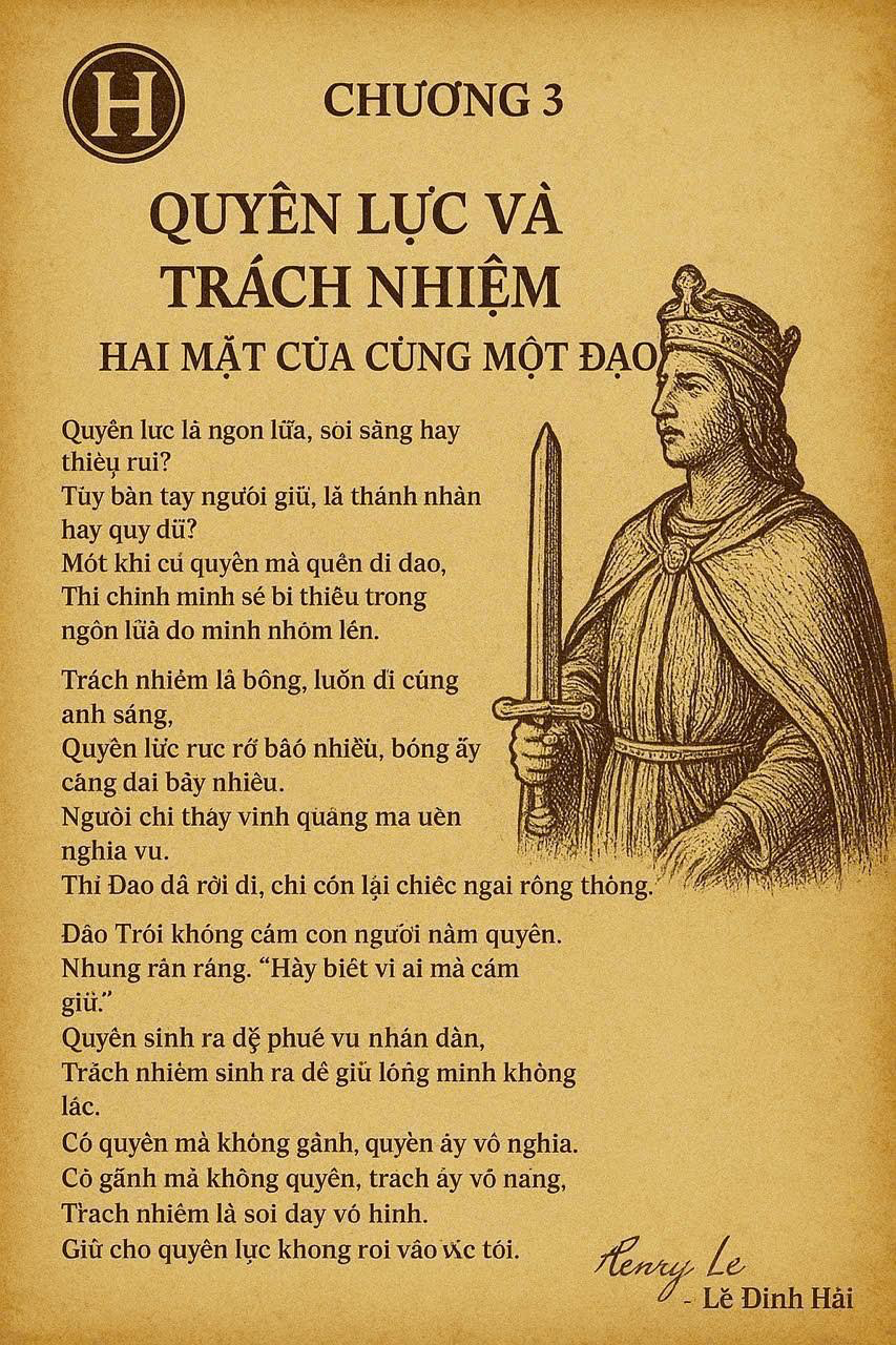 HNI 27/10: Bài thơ chương 3: Quyền Lực Và Trách Nhiệm – Hai Mặt Của Cùng Một Đạo Quyền lực là ngọn lửa, soi sáng hay thiêu rụi? Tùy bàn tay người giữ, là thánh nhân hay quỷ dữ? Một khi có quyền mà quên đi đạo, Thì chính mình sẽ bị thiêu trong ngọn lửa do mình nhóm lên. Trách nhiệm là bóng, luôn đi cùng ánh sáng, Quyền lực rực rỡ bao nhiêu, bóng ấy càng dài bấy nhiêu. Người chỉ thấy vinh quang mà quên nghĩa vụ, Thì Đạo đã rời đi, chỉ còn lại chiếc ngai rỗng không. Đạo Trời không cấm con người nắm quyền, Nhưng răn rằng: “Hãy biết vì ai mà cầm giữ.” Quyền sinh ra để phục vụ nhân dân, Trách nhiệm sinh ra để giữ lòng mình không lạc. Có quyền mà không gánh, quyền ấy vô nghĩa, Có gánh mà không quyền, trách ấy vô năng. Chỉ khi quyền và trách hòa làm một thể, Người lãnh đạo mới thật sự thuận theo Đạo Trời. Quyền là con dao hai lưỡi – sáng cho công lý, Nhưng chỉ một nghiêng lệch, sẽ rạch nát lòng dân. Trách nhiệm là sợi dây vô hình, Giữ cho quyền lực không rơi vào vực tối. Người cầm quyền biết sợ, mới giữ được thiên tâm, Kẻ cầm quyền ngạo mạn, sớm rời thiên vị. Trời chẳng phạt bằng sấm sét hay gươm đao, Mà phạt bằng sự cô độc của kẻ mất lòng dân. Trách nhiệm không là gánh nặng, Mà là thước đo của lương tâm khi có quyền. Người biết sợ chính mình, mới xứng đáng được tin, Người quên sợ Trời, sẽ mất tất cả. Khi quyền lực tìm đến để thử lòng người, Chính trách nhiệm là phép thử của linh hồn. Khi trách nhiệm dẫn đường cho quyền lực, Thì Đạo hiện ra – sáng như bình minh. Đạo không ở ngai vàng, Đạo ở trong từng hành động nhỏ. Khi người cầm quyền cúi đầu vì dân, Chính là lúc Trời nâng họ lên. Quyền lực và trách nhiệm – hai mặt của cùng một Đạo, Tách nhau ra, Đạo vỡ tan thành hỗn loạn. Hợp lại, Đạo trở nên tròn đầy như mặt trăng, Soi chiếu lòng người, và dẫn dắt nhân gian. Đọc ít hơn