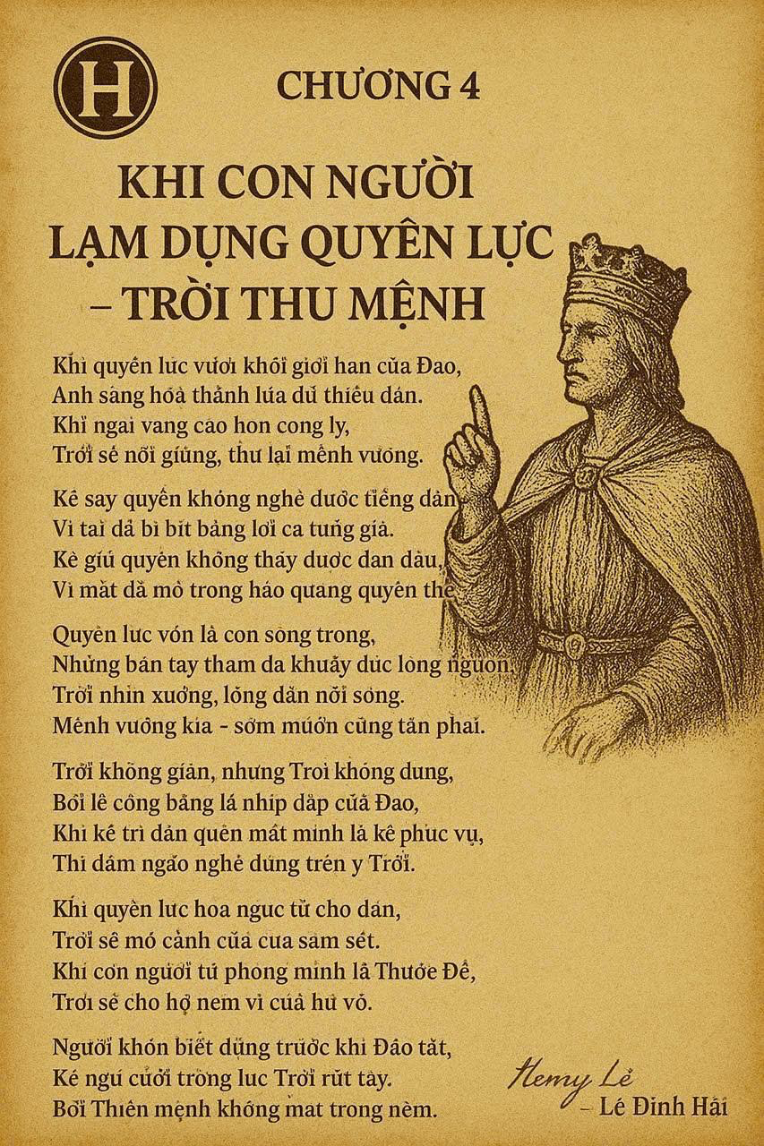 HNI 27/10: Bài thơ chương 4: Khi Con Người Lạm Dụng Quyền Lực – Trời Thu Mệnh Khi quyền lực vượt khỏi giới hạn của Đạo, Ánh sáng hóa thành lửa dữ thiêu dân. Khi ngai vàng cao hơn công lý, Trời sẽ nổi giông, thu lại mệnh vương. Kẻ say quyền không nghe được tiếng dân than, Vì tai đã bị bịt bằng lời ca tụng giả. Kẻ giữ quyền không thấy được dân đau, Vì mắt đã mờ trong hào quang quyền thế. Quyền lực vốn là con sông trong, Nhưng bàn tay tham đã khuấy đục lòng nguồn. Trời nhìn xuống, lòng dân nổi sóng, Mệnh vương kia – sớm muộn cũng tàn phai. Trời không giận, nhưng Trời không dung, Bởi lẽ công bằng là nhịp đập của Đạo. Khi kẻ trị dân quên mất mình là kẻ phục vụ, Thì Thiên mệnh hóa tro bay trong gió. Bao triều đại ngã xuống trong tiếng hò reo, Không vì gươm giáo, mà vì lòng dân vỡ nát. Không vì kẻ thù, mà vì chính sự kiêu căng, Đã dám ngạo nghễ đứng trên ý Trời. Khi quyền lực hóa ngục tù cho dân, Trời sẽ mở cánh cửa của sấm sét. Khi con người tự phong mình là Thượng Đế, Trời sẽ cho họ nếm vị của hư vô. Trời thu mệnh – không cần lời tuyên cáo, Chỉ cần một cơn mưa lạ, một mùa hạn dài. Một niềm tin sụp đổ trong lòng dân, Cũng đủ khiến ngai vàng nứt vỡ. Người khôn biết dừng trước khi Đạo tắt, Kẻ ngu cười trong lúc Trời rút tay. Bởi Thiên mệnh không mất trong một đêm, Mà rời đi từng hơi thở của nhân tâm. Đừng hỏi vì sao Trời im lặng, Vì Trời đang đợi lòng người tự thức tỉnh. Nếu còn một hạt thiện trong quyền lực, Trời sẽ để lại một tia sáng cuối cùng. Nhưng khi bóng tối chiếm hết lòng người, Mệnh Trời không thu, Trời cũng rút Đạo. Và lúc đó, mọi đế vương sẽ hiểu: Quyền lực không phải để sở hữu, mà để phụng sự. Đọc ít hơn