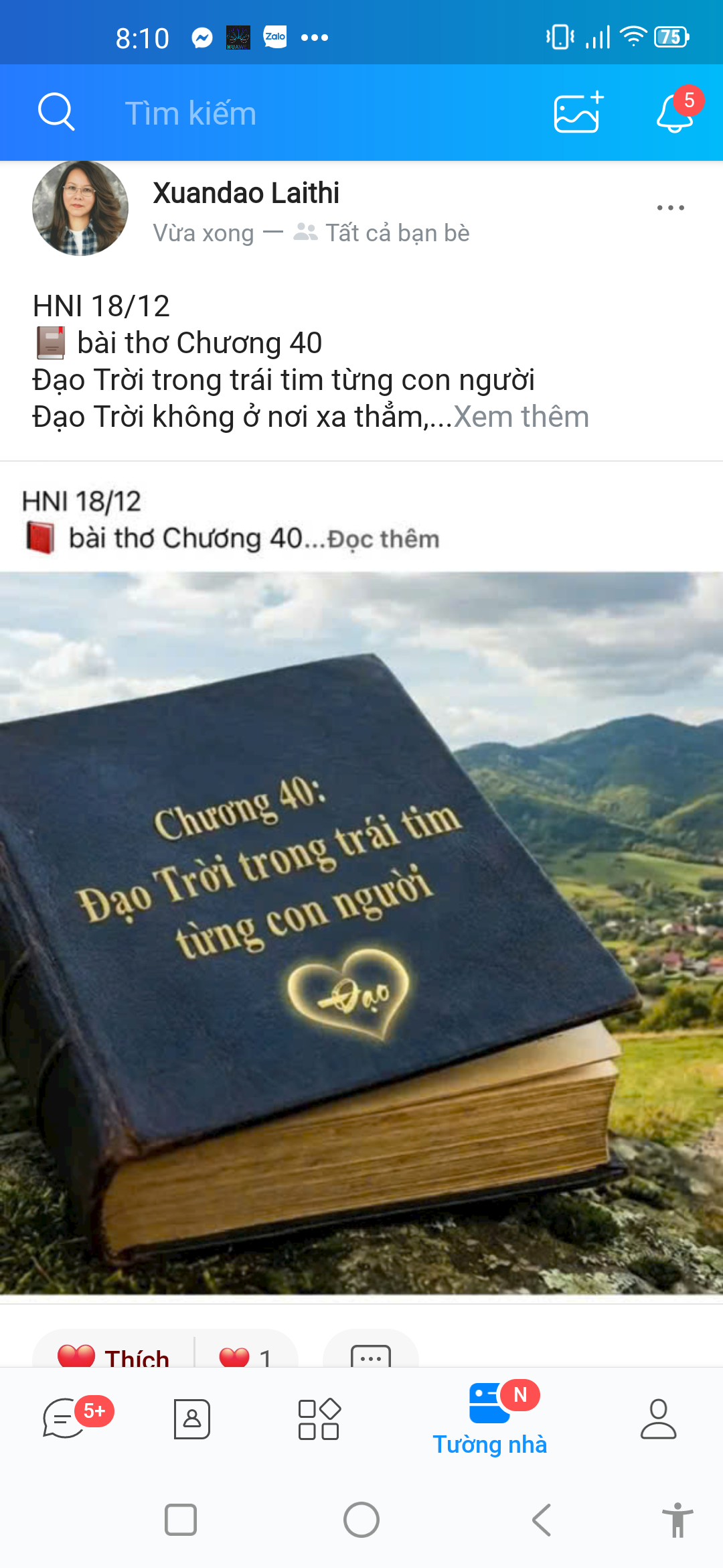 thì Trời – Đạo – Người hòa làm một.HNI 18/12 📕 bài thơ Chương 40 Đạo Trời trong trái tim từng con người Đạo Trời không ở nơi xa thẳm, chẳng nằm ngoài sách vở, kinh chương, Đạo hiện hữu trong từng nhịp thở, và lặng yên giữa trái tim thường. Con người tìm Trời qua muôn ngả, qua núi cao, đền tháp, biển sâu, nhưng quên mất ánh sáng nguyên thủy, đang âm thầm soi chính nội tâm nhau. Trái tim là nơi Trời cư ngụ, khi lòng trong thì Đạo hiển bày, một ý thiện khởi lên lặng lẽ, cũng làm vũ trụ sáng thêm ngày. Không cần danh xưng hay nghi lễ, chỉ cần sống thật với lương tri, khi yêu thương đi trước phán xét, thì Đạo Trời đã có mặt tức thì. Mỗi con người là một ngôi đền sống, xây bằng lựa chọn giữa đời thường, mỗi hành động gieo nhân tỉnh thức, là một lần Trời chạm cõi người thương. Khi ai cũng quay về trái tim, không còn sợ hãi hay chia rẽ, Đạo Trời lan tỏa qua nhân thế, như mạch nguồn sống chẳng bao giờ khép. Hành trình lớn nhất không ra ngoài, mà là trở về nơi ta đứng, khi con người sống bằng ánh sáng bên trong, thì Trời – Đạo – Người hòa làm một.0 Bình luận 0 Chia sẽ1