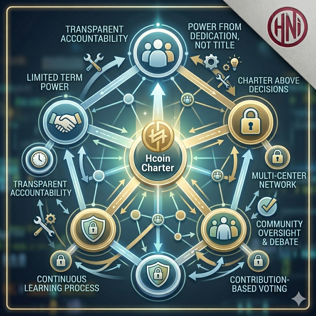 Hệ thống quản trị của Hcoin dựa trên năm nguyên tắc cốt lõi: quyền lực phải xuất phát từ sự cống hiến chứ không từ chức danh; quyền lực có thời hạn chứ không vĩnh viễn; mọi quyền hạn phải đi kèm trách nhiệm minh bạch; cộng đồng có quyền giám sát và phản biện; và Hiến chương luôn đứng trên mọi quyết định.