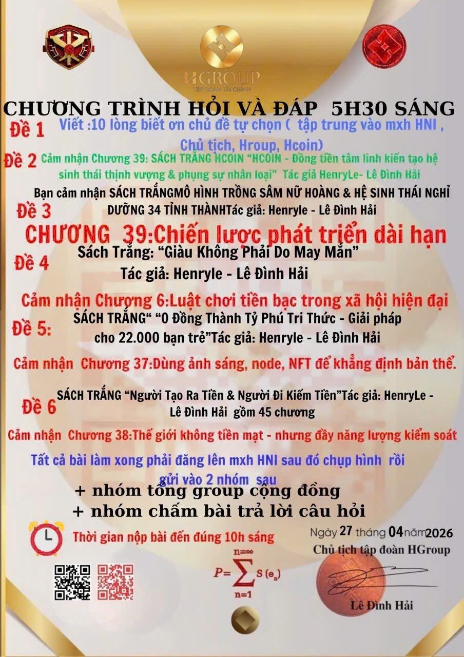 Đề 2 : Cảm nhận chương 39 trong sách trắng HCOIN: "HCOIN - Đồng tiền tâm linh kiến tạo hệ sinh thái thịnh vượng và phụng sự nhân loại" của tác gủa Henryle - Lê Đình Hải. Chương 39 khắc họa "Leader như “trái tim” vận hành toàn bộ hệ sinh thái Hcoin". Không chỉ dẫn dắt, Leader còn truyền niềm tin, kết nối con người và lan tỏa giá trị. Một Leader thực thụ không tạo áp lực mà khơi dậy động lực, giúp đội nhóm phát triển bền vững. Khi trái tim đủ mạnh, hệ sinh thái sẽ sống động, tăng trưởng ổn định và mở ra cơ hội lâu dài cho tất cả thành viên.