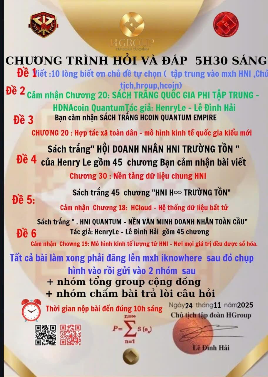 Tôi cũng ấn tượng với Quantum Ledger – sổ cái lượng tử đảm bảo minh bạch tuyệt đối, loại bỏ hoàn toàn gian lận và trung gian. Điều này làm cho mô hình kinh tế trở nên công bằng, tự vận hành và bền vững.Mô hình kinh tế lượng tử HNI không chỉ giúp cá nhân phát triển, mà còn tạo ra một cộng đồng giàu tri thức, giàu giá trị và giàu kết nối.