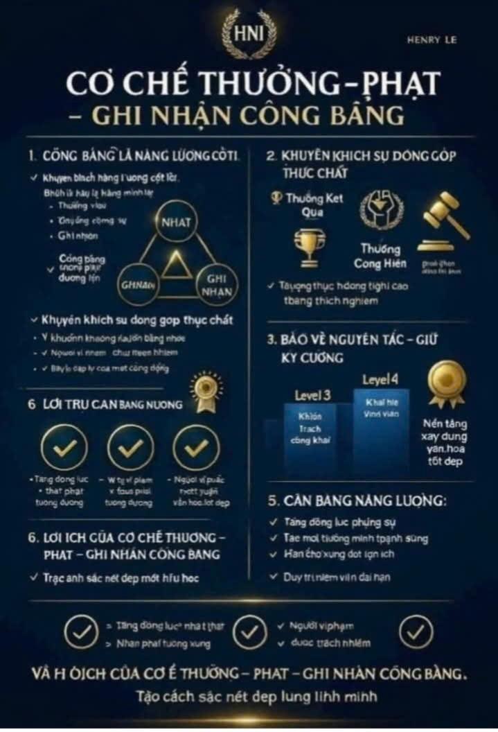 Không một tổ chức nào có thể trường tồn nếu thiếu một hệ thống thưởng – phạt – ghi nhận minh bạch, nhất quán và công bằng. Đây chính là công cụ điều tiết hành vi, tạo động lực, và bảo vệ văn hóa. Đối với Hội Doanh Nhân HNI – nơi quy tụ những doanh nhân ưu tú, tư duy độc lập và phẩm chất lãnh đạo mạnh mẽ – cơ chế này càng phải được thiết kế ở mức tối giản – rõ ràng – không cảm tính.