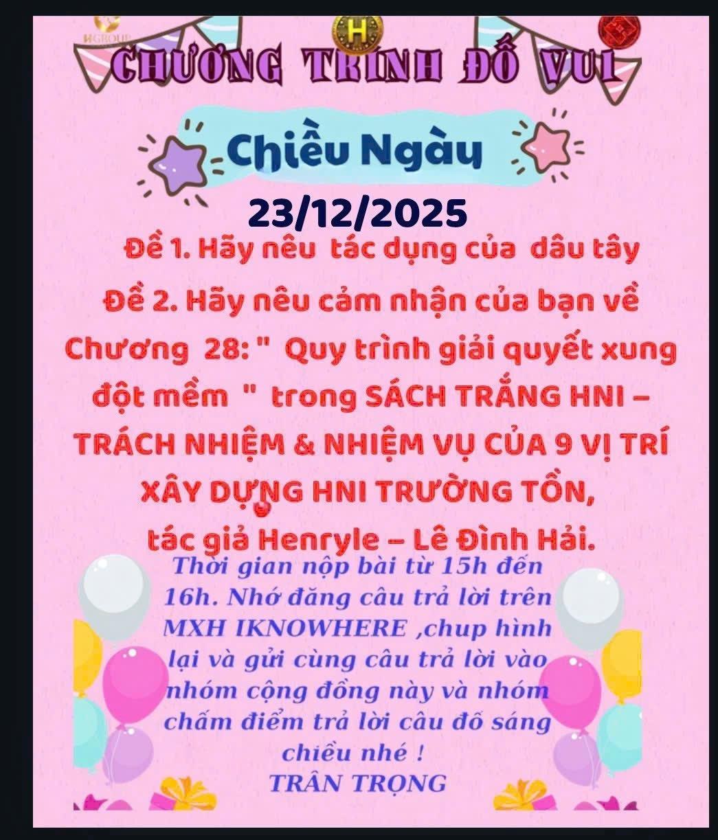 Nội dung Chương 28 trong SÁCH TRẮNG HNI mang đến cho tôi góc nhìn nhân văn và sâu sắc về cách giải quyết xung đột trong tổ chức. Tác giả nhấn mạnh “xung đột mềm” không phải là né tránh mâu thuẫn, mà là xử lý bằng sự thấu hiểu, lắng nghe và tôn trọng lẫn nhau. Quy trình này giúp các bên giữ được năng lượng tích cực, duy trì sự đoàn kết và hướng tới mục tiêu chung của HNI. Tôi cảm nhận đây là nền tảng quan trọng để xây dựng một hệ thống bền vững, nơi con người được kết nối bằng trí tuệ, đạo đức và lòng bao dung.