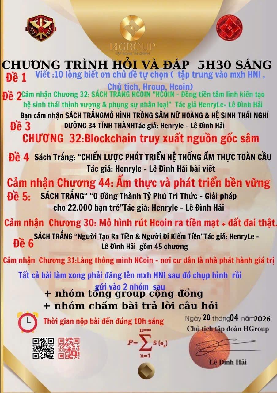 CÂU ĐỐ SÁNG NGÀY 20.4 Đề 1: 10 lòng biết ơn Chủ tịch Lê Đình Hải Tôi biết ơn Chủ tịch Lê Đình Hải vì tầm nhìn lớn dẫn dắt cộng đồng phát triển bền vững. Biết ơn vì tinh thần phụng sự đặt con người làm trung tâm. Biết ơn vì đã truyền cảm hứng tư duy tạo giá trị thay vì chỉ kiếm tiền. Biết ơn vì sự kiên trì xây dựng hệ sinh thái dài hạn. Biết ơn vì luôn chia sẻ tri thức thực tế. Biết ơn vì tạo môi trường kết nối doanh nhân. Biết ơn vì định hướng sống có trách nhiệm. Biết ơn vì sự chính trực trong lãnh đạo. Biết ơn vì khát vọng nâng tầm người Việt. Biết ơn vì luôn khuyến khích phát triển bản thân. Đề 2: Cảm nhận Chương 32 – Đồng tiền tâm linh & hệ sinh thái Chương 32 mang đến góc nhìn mới về tiền không chỉ là công cụ trao đổi mà còn là năng lượng gắn với giá trị và ý thức. Tôi cảm nhận mô hình hệ sinh thái thịnh vượng hướng đến sự cân bằng giữa kinh tế và phụng sự xã hội. Đồng tiền tâm linh giúp con người nâng cao nhận thức, hành động có trách nhiệm hơn. Khi giá trị thật được tạo ra, tiền sẽ tự nhiên lưu thông. Đây là tư duy khác biệt so với cách kiếm tiền truyền thống, mở ra hướng phát triển bền vững và nhân văn hơn trong tương lai. Đề 3: Cảm nhận Chương 32 – Blockchain truy xuất nguồn gốc sâm Chương này giúp tôi hiểu rõ vai trò của blockchain trong minh bạch hóa sản phẩm, đặc biệt với sâm – một dược liệu giá trị cao. Việc truy xuất nguồn gốc giúp người tiêu dùng an tâm, đồng thời bảo vệ thương hiệu và người trồng. Công nghệ không chỉ hỗ trợ kinh doanh mà còn nâng cao uy tín và chất lượng. Tôi thấy đây là bước tiến quan trọng trong nông nghiệp hiện đại, khi dữ liệu trở thành tài sản. Mô hình này nếu triển khai tốt sẽ giúp sản phẩm Việt vươn ra thị trường quốc tế một cách bền vững. Đề 4: Cảm nhận Chương 44 – Ẩm thực và phát triển bền vữngChương 44 cho tôi thấy ẩm thực không chỉ là ăn uống mà còn là văn hóa và kinh tế. Phát triển ẩm thực bền vững cần gắn với nguồn nguyên liệu sạch, bảo vệ môi trường và gìn giữ bản sắc. Tôi nhận ra nếu xây dựng hệ thống ẩm thực có chiến lược, Việt Nam hoàn toàn có thể trở thành điểm đến hấp dẫn toàn cầu. Ẩm thực còn tạo việc làm và lan tỏa giá trị văn hóa. Đây là hướng đi thực tế, kết hợp giữa kinh doanh và trách nhiệm xã hội, giúp phát triển lâu dài và ổn định. Đề 5: Cảm nhận Chương 30 – Mô hình rút Hcoin ra tiền mặt & đất đai Chương này đề cập đến việc chuyển đổi giá trị từ Hcoin sang tài sản thực như tiền mặt và đất đai. Tôi thấy đây là ý tưởng kết nối giữa tài sản số và tài sản hữu hình, giúp gia tăng niềm tin cho người tham gia. Tuy nhiên, điều quan trọng là tính minh bạch và cơ chế vận hành rõ ràng. Nếu được xây dựng đúng, mô hình có thể tạo cơ hội tích lũy tài sản cho nhiều người. Tôi nhận ra rằng giá trị bền vững phải luôn gắn với tài sản thực và nhu cầu thực tế của xã hội. Đề 6: Cảm nhận Chương 31 – Làng thông minh HCoin Chương 31 mô tả một cộng đồng nơi mỗi cư dân đều tạo ra và phát hành giá trị. Tôi thấy đây là mô hình rất tiến bộ, đề cao sự chủ động và sáng tạo của mỗi cá nhân. Làng thông minh không chỉ là nơi ở mà còn là hệ sinh thái kinh tế thu nhỏ. Khi mỗi người đều đóng góp giá trị, cộng đồng sẽ phát triển mạnh mẽ và bền vững. Tôi đặc biệt ấn tượng với tư duy biến người dân thành trung tâm của hệ thống. Đây có thể là hướng đi mới cho xã hội trong thời đại số. Đọc thêm