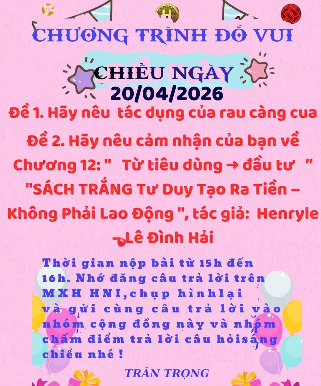 HNI 21/4/2026 - CÂU ĐỐ CHIỀU Đề 1: Tác dụng của rau càng cua: Tác dụng của rau càng cua 1. Thanh nhiệt, giải độc Có tính mát, giúp giải nhiệt cơ thể, đặc biệt tốt khi trời nóng Hỗ trợ giảm nóng trong, nổi mụn 2. Hỗ trợ tiêu hóa Giàu chất xơ → giúp nhuận tràng, giảm táo bón Kích thích tiêu hóa nhẹ nhàng 3. Giúp kiểm soát đường huyết Một số nghiên cứu cho thấy rau càng cua có thể giảm đường huyết, tốt cho người tiểu đường (ở mức hỗ trợ) 4. Chống viêm, kháng khuẩn Có hoạt chất giúp giảm viêm, hỗ trợ các bệnh viêm nhẹ như viêm họng, viêm da 5. Tốt cho tim mạch Chứa chất chống oxy hóa → giúp giảm cholesterol xấu, bảo vệ tim 6. Bổ sung dưỡng chất Giàu: Vitamin A, C Canxi, sắt → giúp tăng sức đề kháng, tốt cho xương và da Lưu ý khi ăn Không nên ăn quá nhiều vì có thể gây lạnh bụng Người bị tiêu chảy, huyết áp thấp nên hạn chế Nên rửa sạch kỹ vì rau thường mọc sát đất. Đề 2: Cảm nhận Chương 12: "Từ Tiêu Dùng Đến Đầu Tư" trong sách trắng "Tư Duy Tạo Ra Tiền - Không Phải Lao Động" của tác giả Henry Lê là một chương mang tính thức tỉnh rất mạnh. Chương này giúp người đọc nhận ra rằng phần lớn người nghèo không nghèo vì kiếm ít tiền, mà vì dùng tiền sai cách. Họ quen tiêu dùng để thỏa mãn cảm xúc ngắn hạn nhưng lại quên đầu tư cho tương lai dài hạn. Henry Lê chỉ ra một sự thật đơn giản: tiêu dùng làm tiền rời xa bạn, còn đầu tư giúp tiền quay trở lại và sinh sôi. Một chiếc điện thoại mới, quần áo hàng hiệu hay những cuộc vui tốn kém chỉ mang niềm vui nhất thời. Nhưng cùng số tiền đó, nếu đầu tư vào kỹ năng, kiến thức, công cụ làm việc hoặc tài sản tạo dòng tiền, nó có thể thay đổi cả cuộc đời. Đây là điểm khác biệt giữa tư duy sống hôm nay và tư duy xây dựng ngày mai. Tôi đặc biệt tâm đắc với thông điệp: trước khi mua món đồ, hãy hỏi nó lấy tiền của mình hay tạo ra tiền cho mình. Câu hỏi nhỏ này có thể thay đổi mọi quyết định tài chính. Người giàu không ngừng học cách biến chi tiêu thành tài sản, còn người nghèo thường biến thu nhập thành hóa đơn. Chương 12 không dạy keo kiệt hay sống kham khổ, mà dạy tiêu tiền thông minh hơn. Khi biết chuyển từ tiêu dùng cảm tính sang đầu tư có chiến lược, mỗi đồng tiền trở thành một hạt giống. Và những hạt giống ấy, nếu gieo đúng nơi, sẽ mọc thành khu rừng tài chính trong tương lai.