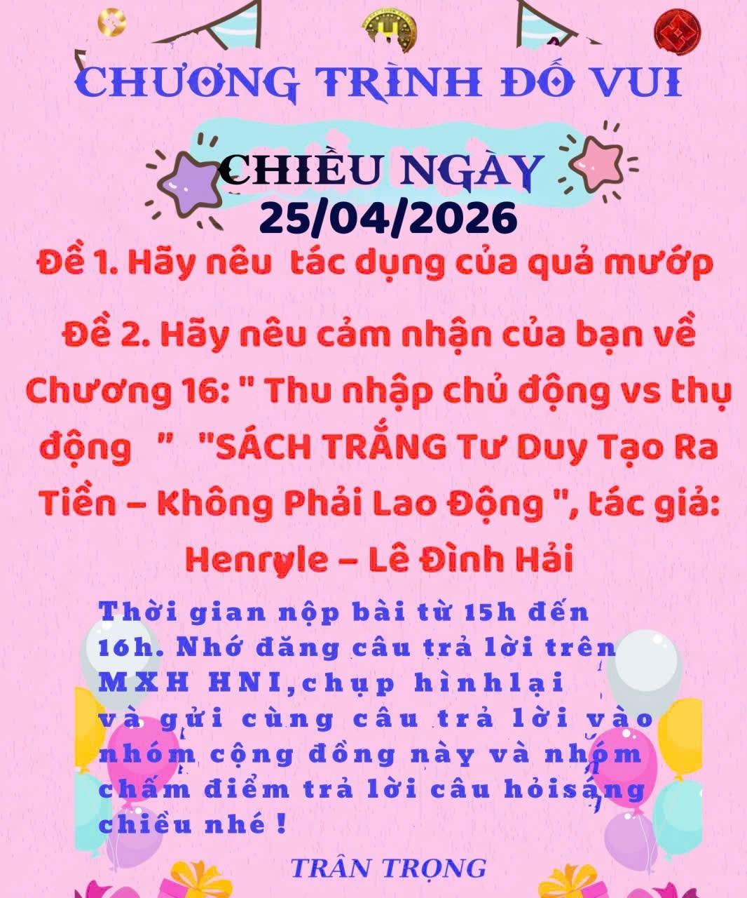 Chương “Thu nhập chủ động vs thụ động” giúp tôi hiểu rõ hơn về cách tạo ra tiền. Thu nhập chủ động là khi ta phải làm việc liên tục để kiếm tiền, còn thu nhập thụ động là dòng tiền vẫn đến dù không trực tiếp lao động mỗi ngày. Tác giả nhấn mạnh tầm quan trọng của việc xây dựng nguồn thu nhập thụ động để đạt tự do tài chính. Điều này khiến tôi nhận ra rằng chỉ chăm chỉ thôi chưa đủ, mà cần tư duy đầu tư thông minh. Chương sách mang lại động lực để tôi thay đổi cách nghĩ và hướng tới tương lai bền vững hơn.HNI 25/4/2026: Trả lời câu đố chiều: Đề 1: Tác dụng của quả mướp: Quả mướp là thực phẩm quen thuộc, mang lại nhiều lợi ích cho sức khỏe. Mướp chứa nhiều nước, vitamin và chất xơ, giúp thanh nhiệt, giải độc cơ thể, đặc biệt tốt trong những ngày nắng nóng. Ăn mướp thường xuyên hỗ trợ tiêu hóa, ngăn ngừa táo bón và giúp da sáng mịn hơn. Ngoài ra, mướp còn có tác dụng hỗ trợ giảm cân nhờ lượng calo thấp. Trong dân gian, mướp còn được dùng để nấu nước gội đầu giúp tóc mềm mượt. Không chỉ là món ăn ngon, mướp còn là vị thuốc tự nhiên an toàn. Đề 2: Cảm nhận về “Thu nhập chủ động vs thụ động” trong "Sách trắng Tư duy tạo ra tiền - Không phải lao động". Chương “Thu nhập chủ động vs thụ động” giúp tôi hiểu rõ hơn về cách tạo ra tiền. Thu nhập chủ động là khi ta phải làm việc liên tục để kiếm tiền, còn thu nhập thụ động là dòng tiền vẫn đến dù không trực tiếp lao động mỗi ngày. Tác giả nhấn mạnh tầm quan trọng của việc xây dựng nguồn thu nhập thụ động để đạt tự do tài chính. Điều này khiến tôi nhận ra rằng chỉ chăm chỉ thôi chưa đủ, mà cần tư duy đầu tư thông minh. Chương sách mang lại động lực để tôi thay đổi cách nghĩ và hướng tới tương lai bền vững hơn.0 Comments 0 Shares1