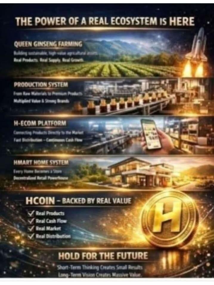 HNI .27/4. 🚀 KHI HỆ SINH THÁI BẮT ĐẦU VẬN HÀNH – GIÁ TRỊ THẬT SẼ LÊN TIẾNG Trong giai đoạn đầu, mọi tài sản đều được định giá bằng niềm tin. Nhưng khi hệ sinh thái bắt đầu vận hành thực tế, giá trị sẽ được quyết định bởi dòng tiền – sản phẩm – thị trường. Và đó chính là thời điểm quan trọng của Hcoin. ⸻ 🌱 TRỤ CỘT 1: VÙNG TRỒNG SÂM NỮ HOÀNG – GIÁ TRỊ TỪ NỀN TẢNG THẬT Việc phát triển vùng trồng sâm nữ hoàng quy mô lớn không chỉ đơn thuần là nông nghiệp, mà là xây dựng: • Chuỗi cung ứng dược liệu giá trị cao • Nguồn nguyên liệu bền vững, lâu dài • Tài sản thật gắn liền với đất và sản xuất Sâm không chỉ là sản phẩm – mà là dòng tiền lặp lại theo chu kỳ, tạo nền móng vững chắc cho toàn bộ hệ sinh thái. ⸻ 🏭 TRỤ CỘT 2: HỆ THỐNG SẢN XUẤT – CHỦ ĐỘNG GIÁ TRỊ Khi có nhà máy sản xuất: • Chủ động chế biến sâu (trà sâm, cafe sâm, thực phẩm chức năng…) • Gia tăng giá trị sản phẩm gấp nhiều lần • Kiểm soát chất lượng & thương hiệu Đây là bước chuyển từ nguyên liệu thô → sản phẩm thương hiệu → lợi nhuận cao. ⸻ 🛒 TRỤ CỘT 3: SÀN THƯƠNG MẠI ĐIỆN TỬ H-ECOM Sự ra đời của H-Ecom giúp: • Kết nối trực tiếp sản phẩm đến người tiêu dùng • Giảm phụ thuộc trung gian • Tạo dòng tiền nhanh và liên tục Đây chính là “đường cao tốc” đưa sản phẩm ra thị trường toàn quốc và quốc tế. ⸻ 🏪 TRỤ CỘT 4: HỆ THỐNG SIÊU THỊ TẠI NHÀ HMART Hmart không chỉ là điểm bán, mà là: • Mạng lưới phân phối phủ rộng • Mô hình “mỗi nhà là một cửa hàng” • Gia tăng tốc độ tiêu thụ sản phẩm Khi hàng triệu điểm bán nhỏ được kết nối, sức mạnh sẽ trở nên khổng lồ. ⸻ 💎 HCOIN – GIÁ TRỊ ĐƯỢC HẬU THUẪN BỞI HỆ SINH THÁI Khi 4 trụ cột cùng vận hành: • Có sản phẩm thật • Có dòng tiền thật • Có thị trường thật • Có hệ thống phân phối thật ➡️ Hcoin không còn là kỳ vọng, mà trở thành tài sản gắn liền với tăng trưởng thực tế. ⸻ 📈 THÔNG ĐIỆP DÀNH CHO CỘNG ĐỒNG Giai đoạn này không còn là lúc nhìn ngắn hạn. Đây là thời điểm của tầm nhìn dài hạn và sự kiên định. • Người bán sớm sẽ nhìn vào hiện tại • Người nắm giữ sẽ nhìn vào tương lai 👉 Giá trị lớn nhất không đến từ việc “lướt sóng”, mà đến từ việc đồng hành cùng một hệ sinh thái đang tăng trưởng. ⸻ 🔥 KẾT LUẬN