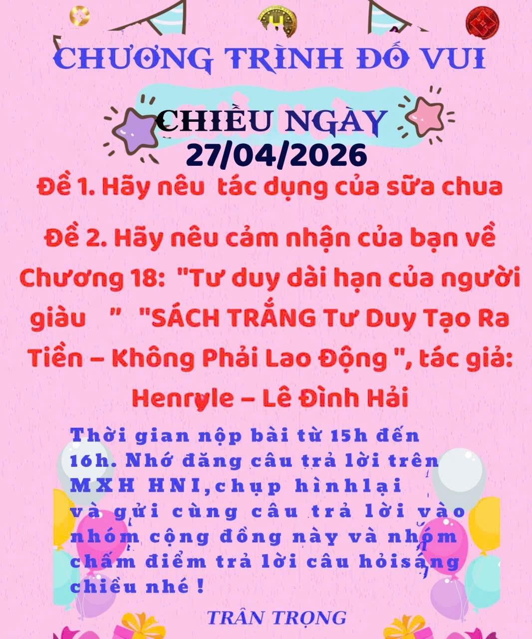 HNI 27/4 - CÂU ĐỐ CHIỀU Đề 1: Tác dụng của sữa chua: Sữa chua (sữa chua) mang lại nhiều lợi ích tốt cho sức khỏe: Tốt cho tiêu hóa: Chứa lợi khuẩn (probiotics) giúp cân bằng hệ vi sinh đường ruột, giảm táo bón và đầy hơi. Tăng cường miễn dịch: Hỗ trợ cơ thể chống lại vi khuẩn có hại. Bổ sung canxi: Giúp xương và răng chắc khỏe. Làm đẹp da: Có thể giúp da mịn màng hơn nhờ vitamin và lợi khuẩn. Hỗ trợ giảm cân: Ít calo (nếu chọn loại không đường), tạo cảm giác no lâu. Nên ăn 1–2 hộp/ngày, tốt nhất sau bữa ăn để hấp thu hiệu quả hơn. Đề 2 : Cảm nhận Chương 28: " Tư duy dài hạn của người giàu". trong : " Sách trắng Tư duy tạo ra tiền - Không phải lao động". Chương 18 trong Sách Trắng của Henry Le (Lê Đình Hải) nhấn mạnh rằng người giàu không chỉ kiếm tiền, mà xây dựng giá trị bền vững theo thời gian. Tư duy dài hạn giúp họ kiên nhẫn trước biến động, không chạy theo lợi ích ngắn hạn. Họ đầu tư vào tri thức, mối quan hệ và hệ thống, thay vì chỉ tập trung lợi nhuận tức thì. Điều này tạo nên sự khác biệt lớn: người giàu kiểm soát tương lai, còn người thiếu tầm nhìn dễ bị cuốn theo hiện tại.