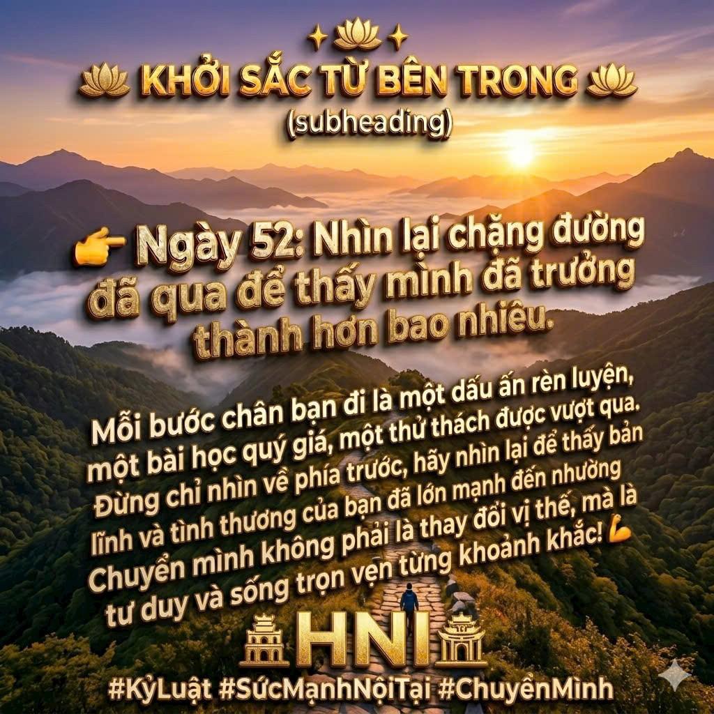 HNI 29/04/2026 🌺 Có những ngày thầm lặng, có những lúc gian nan, nhưng nhìn lại mới thấy: "Ồ, mình đã đi được một quãng đường xa đến thế!" 👉 Ngày 52: Nhìn lại chặng đường đã qua để thấy mình đã trưởng thành hơn bao nhiêu. Cảm ơn quá khứ đã nhào nặn nên một phiên bản vững vàng của hiện tại. Chúc các bạn ngày mới tràn ngập ánh sáng và năng lượng tích cực! #Ngay52 #TruongThanh #SucManhNoiTai #ChuyenMinh #KienDinh