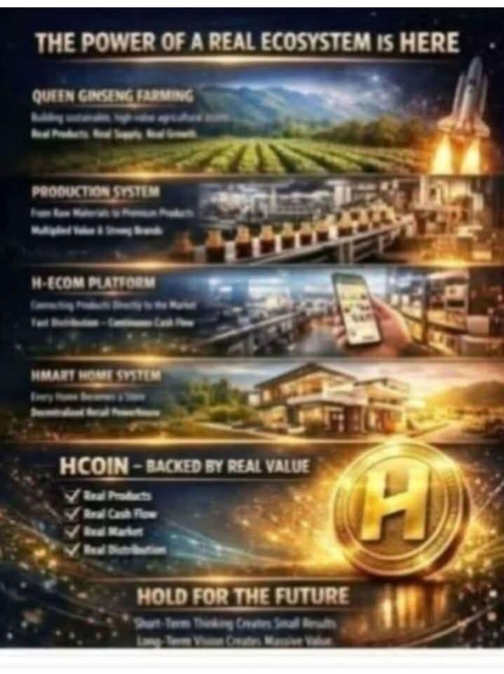 HNI 01/5. 🚀 KHI HỆ SINH THÁI BẮT ĐẦU VẬN HÀNH – GIÁ TRỊ THẬT SẼ LÊN TIẾNG Trong giai đoạn đầu, mọi tài sản đều được định giá bằng niềm tin. Nhưng khi hệ sinh thái bắt đầu vận hành thực tế, giá trị sẽ được quyết định bởi dòng tiền – sản phẩm – thị trường. Và đó chính là thời điểm quan trọng của Hcoin. ⸻ 🌱 TRỤ CỘT 1: VÙNG TRỒNG SÂM NỮ HOÀNG – GIÁ TRỊ TỪ NỀN TẢNG THẬT Việc phát triển vùng trồng sâm nữ hoàng quy mô lớn không chỉ đơn thuần là nông nghiệp, mà là xây dựng: • Chuỗi cung ứng dược liệu giá trị cao • Nguồn nguyên liệu bền vững, lâu dài • Tài sản thật gắn liền với đất và sản xuất Sâm không chỉ là sản phẩm – mà là dòng tiền lặp lại theo chu kỳ, tạo nền móng vững chắc cho toàn bộ hệ sinh thái. ⸻ 🏭 TRỤ CỘT 2: HỆ THỐNG SẢN XUẤT – CHỦ ĐỘNG GIÁ TRỊ Khi có nhà máy sản xuất: • Chủ động chế biến sâu (trà sâm, cafe sâm, thực phẩm chức năng…) • Gia tăng giá trị sản phẩm gấp nhiều lần • Kiểm soát chất lượng & thương hiệu Đây là bước chuyển từ nguyên liệu thô → sản phẩm thương hiệu → lợi nhuận cao. ⸻ 🛒 TRỤ CỘT 3: SÀN THƯƠNG MẠI ĐIỆN TỬ H-ECOM Sự ra đời của H-Ecom giúp: • Kết nối trực tiếp sản phẩm đến người tiêu dùng • Giảm phụ thuộc trung gian • Tạo dòng tiền nhanh và liên tục Đây chính là “đường cao tốc” đưa sản phẩm ra thị trường toàn quốc và quốc tế. ⸻ 🏪 TRỤ CỘT 4: HỆ THỐNG SIÊU THỊ TẠI NHÀ HMART Hmart không chỉ là điểm bán, mà là: • Mạng lưới phân phối phủ rộng • Mô hình “mỗi nhà là một cửa hàng” • Gia tăng tốc độ tiêu thụ sản phẩm Khi hàng triệu điểm bán nhỏ được kết nối, sức mạnh sẽ trở nên khổng lồ. ⸻ 💎 HCOIN – GIÁ TRỊ ĐƯỢC HẬU THUẪN BỞI HỆ SINH THÁI Khi 4 trụ cột cùng vận hành: • Có sản phẩm thật • Có dòng tiền thật • Có thị trường thật • Có hệ thống phân phối thật ➡️ Hcoin không còn là kỳ vọng, mà trở thành tài sản gắn liền với tăng trưởng thực tế. ⸻ 📈 THÔNG ĐIỆP DÀNH CHO CỘNG ĐỒNG Giai đoạn này không còn là lúc nhìn ngắn hạn. Đây là thời điểm của tầm nhìn dài hạn và sự kiên định. • Người bán sớm sẽ nhìn vào hiện tại • Người nắm giữ sẽ nhìn vào tương lai 👉 Giá trị lớn nhất không đến từ việc “lướt sóng”, mà đến từ việc đồng hành cùng một hệ sinh thái đang tăng trưởng. ⸻ 🔥 KẾT LUẬN