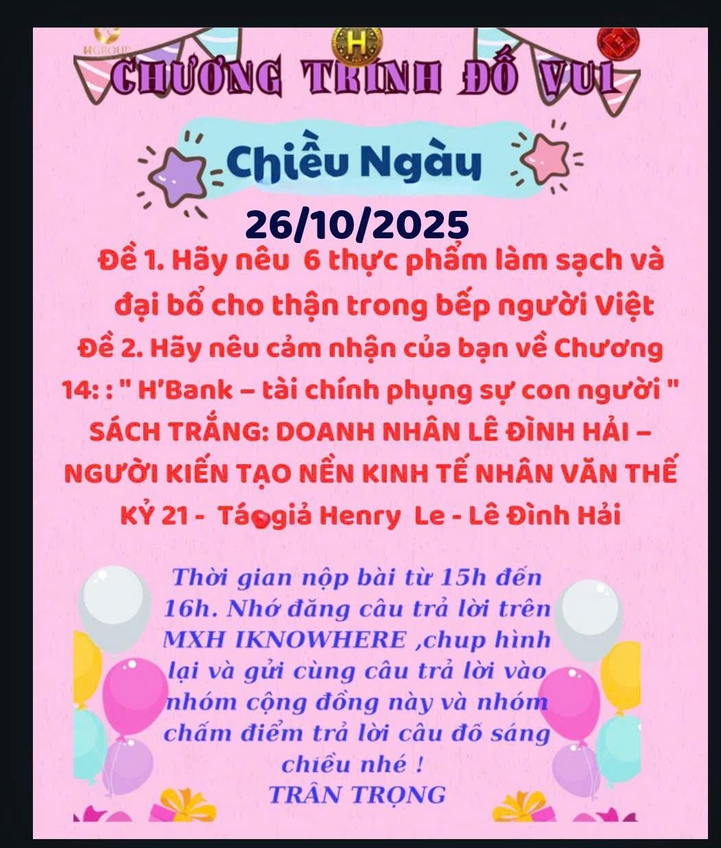 TRẢ LỜI CÂU ĐỐ BUỔI CHIỀU NGÀY 26.10 👉🏻ĐỀ 1: 6 THỰC PHẨM LÀM SẠCH VÀ ĐẠI BỔ CHO THẬN TRONG BẾP NGƯỜI VIỆT Trong gian bếp Việt, có nhiều loại thực phẩm dân dã nhưng lại là “thần dược” giúp thanh lọc, phục hồi và đại bổ cho thận – cơ quan được ví như “gốc rễ của sự sống”. Dưới đây là 6 thực phẩm tiêu biểu: 1. Đậu đen: Giúp thanh nhiệt, giải độc, lợi tiểu, tăng cường chức năng lọc máu của thận. Nước đậu đen rang là thức uống tuyệt vời cho người muốn dưỡng thận. 2. Rau ngò om: Có tính mát, giúp đào thải độc tố, giảm sỏi thận, lợi tiểu và điều hòa huyết áp. 3. Mướp đắng (khổ qua): Làm mát máu, thanh lọc cơ thể, giảm áp lực cho thận khi phải xử lý độc tố. 4. Hạt sen: Không chỉ bổ thận mà còn dưỡng tâm, an thần, rất tốt cho người thận yếu hay mất ngủ. 5. Cá chép: Là thực phẩm bổ khí huyết, lợi tiểu, giảm phù nề, giúp thận hoạt động trơn tru hơn. 6. Rau cải xanh: Giàu vitamin và khoáng chất, giúp giải độc gan thận, tăng khả năng bài tiết các chất cặn bã. 👉 Tổng kết: Duy trì chế độ ăn với những thực phẩm trên không chỉ giúp thận khỏe mạnh mà còn tăng cường năng lượng sống, hỗ trợ tinh – khí – thần, đúng với triết lý “ăn để sống khỏe” của người Việt xưa. 👉🏻ĐỀ 2: CẢM NHẬN VỀ CHƯƠNG 14 – “H’BANK: TÀI CHÍNH PHỤNG SỰ CON NGƯỜI” (Sách Trắng: Doanh nhân Lê Đình Hải – Người kiến tạo nền kinh tế nhân văn thế kỷ 21, tác giả Henry Lê – Lê Đình Hải) Chương 14 của Sách Trắng mang đến một góc nhìn mới mẻ và sâu sắc về lĩnh vực tài chính – một lĩnh vực vốn được xem là khô khan và đầy cạnh tranh. Tuy nhiên, với tư tưởng “phụng sự con người”, H’Bank đã được Doanh nhân Lê Đình Hải kiến tạo như một ngân hàng nhân văn, nơi tài chính không chỉ là con số mà là công cụ lan tỏa yêu thương, giúp con người hạnh phúc hơn. Tác giả Henry Lê đã thể hiện rõ triết lý “tiền không chỉ để sinh lời, mà còn để sinh phúc”. H’Bank không dừng lại ở việc cấp vốn, mà còn đồng hành cùng con người trong hành trình phát triển – từ khởi nghiệp, xây dựng doanh nghiệp, đến an cư và thịnh vượng. Đây chính là mô hình “tài chính tử tế” – một làn gió mới trong thế giới hiện đại đầy biến động.