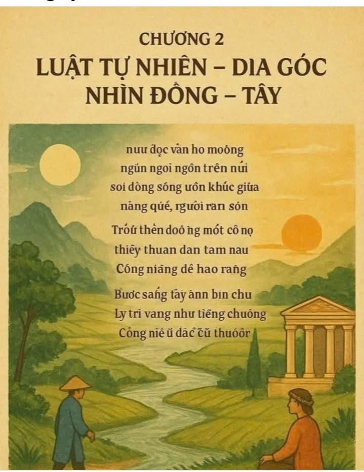 HNI 27/10 - BÀI THƠ CHƯƠNG 2 : LUẬT TỰ NHIÊN – ĐÔNG VÀ TÂY Trăng phương Đông sáng ngời trên đỉnh núi, Soi dòng sông uốn khúc giữa làng quê. Người hiền học Đạo Trời nơi cỏ nội, Thấy công bằng trong một chiếc lá tre. Trời – Đất vốn điều hòa muôn quy luật, Sống thuận theo thì an lạc, bền lâu. Đông Á dạy: nhân nghĩa là nền tảng, Công lý đến từ đạo đức trong nhau. Bước sang Tây, ánh bình minh rực rỡ, Lý trí vang như tiếng chuông ngân xa. Con người hỏi: điều gì là công chính? Và viết thành bộ luật để điều hòa. Hy Lạp cổ luận bàn về chính nghĩa, La Mã xưa khắc đá những lời thề. Công lý ấy từ lý trí soi chiếu, Xây thành lâu đài pháp trị muôn đời. Đông – Tây khác nhưng hòa trong bản thể, Một bên sâu vào tâm thức, luân thường. Một bên dựng thành nguyên tắc, định chế, Cùng hướng về lẽ công bằng, tình thương. Luật tự nhiên – dòng sông chung bất tận, Chảy muôn nơi, hợp lại một đại dương. Đạo Trời ở Đông, Lý trí ở Tây, Cùng soi sáng cho nhân loại quang minh. Người học luật chớ chia ranh Đông – Tây, Hãy nhìn thấy mạch nguồn chung bất biến. Công lý thật không biên giới, bờ cõi, Như ánh dương tỏa rạng khắp nhân gian.