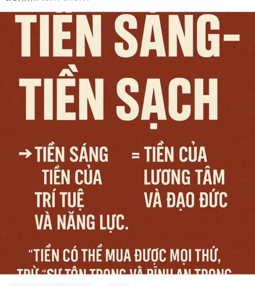 HNI 27/10: “TIỀN SÁNG – TIỀN SẠCH” Tiền không xấu. Xấu là cách người ta kiếm tiền và xài tiền. Có người bán rẻ nhân cách để mua sự giàu sang. Cũng có người dùng trí tuệ và tử tế để đổi lấy tự do. 👉 “Tiền sáng” là tiền của trí tuệ và năng lực. 👉 “Tiền sạch” là tiền của lương tâm và đạo đức. Tiền sáng giúp ta ngẩng cao đầu. Tiền sạch giúp ta ngủ yên giấc. Làm giàu không khó, Giữ nhân cách khi giàu mới khó. Thà chậm hơn một chút, nhưng đi bằng con đường sáng và sạch. Bởi vì — > Tiền có thể mua được mọi thứ, trừ “sự tôn trọng và bình an trong tim”. #TiềnSángTiềnSạch #TưDuyLàmGiàuĐúngNghĩa #GiàuCảTâmLẫnTầm #MarketingĐạoĐức #ChơiĐỉnhSốngĐẹp