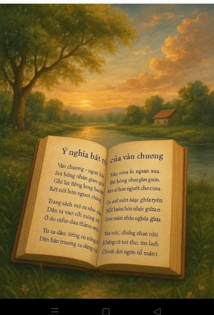 HNI 27/10 - BÀI THƠ CHƯƠNG 1 : Ý NGHĨA BẤT TỬ CỦA VĂN CHƯƠNG Văn chương – ngọn lửa từ ngàn xưa, Soi bóng nhân gian giữa nắng mưa. Ghi lại tiếng lòng bao thế hệ, Kết nối hồn người chẳng xóa nhòa. Trang sách mở ra như cánh cửa, Dẫn ta vào cõi mộng vô biên. Ở đó niềm đau thành ánh sáng, Nỗi buồn hóa nhạc giữa bình yên. Từ ca dao, tiếng ru nồng thuở nhỏ, Đến bản trường ca dựng nước ngàn năm. Từng chữ gieo hồn như hạt giống, Ươm mầm nhân nghĩa giữa trần gian. Văn học – chứng nhân bao đổi thay, Ngẩng đầu giữa gió bụi tháng ngày. Khi con người còn khát khao sống, Thì văn chương còn bất tử nơi đây. Không có văn chương, đời khô cạn, Không có lời thơ, tim lạnh lùng. Chính bởi ngôn từ mà nhân loại, Biết yêu, biết khóc, biết anh hùng. Ôi, sức mạnh lặng thầm bất tử, Khắc trên giấy trắng dấu chân người. Văn học chẳng già, không chết, Mà hóa thành vĩnh viễn muôn đời. Đọc ít hơn Đọc thêm