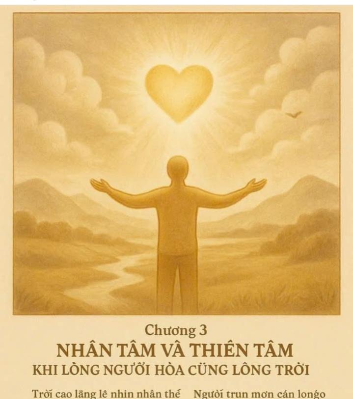 HNI 27/10 - BÀI THƠ CHƯƠNG 3 : NHÂN TÂM VÀ THIÊN TÂM – KHI LÒNG NGƯỜI HÒA CÙNG LÒNG TRỜI (Thơ triết lý – HenryLe) Trời cao lặng lẽ nhìn nhân thế, Người nhỏ nhoi lại chứa cả trời. Giữa một hơi thở – hai tâm gặp, Một bên là Trời, một bên là Người. Nhân tâm như nước trong lòng suối, Phản chiếu vòm xanh của cõi Trời. Khi trong vắt – mây trời rực sáng, Khi đục mờ – trăng cũng xa rời. Thiên tâm chẳng ở đâu xa, Chỉ cần người mở cửa lòng ra. Khi buông tham, khi buông sân hận, Trời sẽ vào như ánh trăng ngà. Đôi khi nhân gian đầy giông gió, Không phải Trời, mà do lòng người. Khi tâm động, muôn loài nghiêng ngả, Khi tâm an, vũ trụ mỉm cười. Thiên tâm vốn chẳng thiên vị ai, Người thuận Đạo thì Trời cùng lại. Tâm trong sáng – là Trời đang sáng, Tâm tối mù – là Trời đang phai. Khi người thương, đất trời nở rộ, Khi người hận, mây gió đìu hiu. Khi người biết cảm thông giọt lệ, Là Thiên tâm trong máu đang kêu. Nhân tâm – chiếc gương của Thiên đạo, Phải lau từng lớp bụi thời gian. Mỗi niệm thiện – là lau thêm một chút, Cho Trời hiện rõ trong lòng phàm. Trời không ở trên, Trời trong người, Trong ánh mắt biết soi điều phải. Trong tiếng cười không đớn hận ai, Trong giấc ngủ yên, lòng không nặng trái. Có lúc nhân tâm như lá nhỏ, Giữa bão đời – vẫn vững, vẫn xanh. Vì biết có Trời luôn cùng thở, Trong mỗi nhịp đập, trong mạch lành. Khi lòng người hòa cùng lòng Trời, Không còn ngăn cách, chẳng còn lời. Chỉ còn hơi thở hòa cùng vũ trụ, Một cõi nhân – thiên đồng sáng soi.