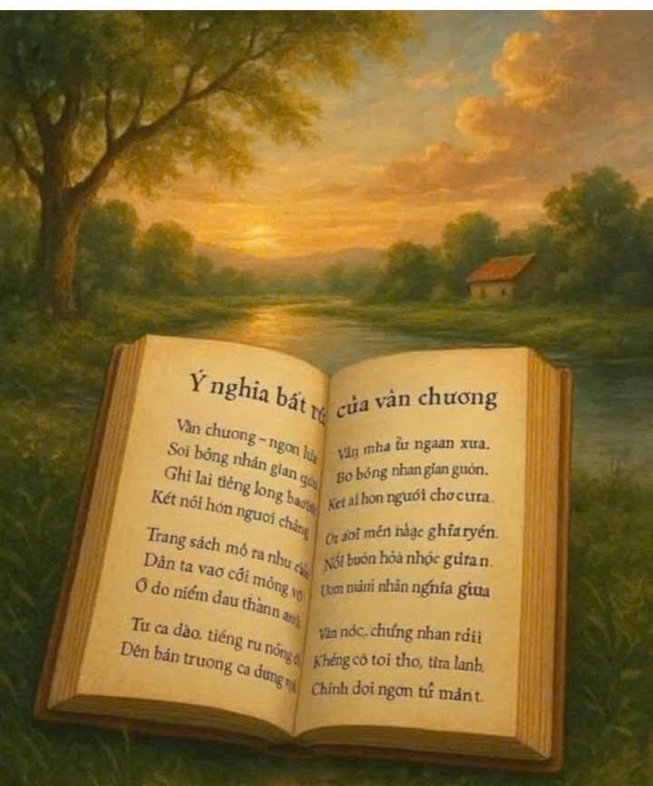 HNI 27/10 - BÀI THƠ CHƯƠNG 1 : Ý NGHĨA BẤT TỬ CỦA VĂN CHƯƠNG Văn chương – ngọn lửa từ ngàn xưa, Soi bóng nhân gian giữa nắng mưa. Ghi lại tiếng lòng bao thế hệ, Kết nối hồn người chẳng xóa nhòa. Trang sách mở ra như cánh cửa, Dẫn ta vào cõi mộng vô biên. Ở đó niềm đau thành ánh sáng, Nỗi buồn hóa nhạc giữa bình yên. Từ ca dao, tiếng ru nồng thuở nhỏ, Đến bản trường ca dựng nước ngàn năm. Từng chữ gieo hồn như hạt giống, Ươm mầm nhân nghĩa giữa trần gian. Văn học – chứng nhân bao đổi thay, Ngẩng đầu giữa gió bụi tháng ngày. Khi con người còn khát khao sống, Thì văn chương còn bất tử nơi đây. Không có văn chương, đời khô cạn, Không có lời thơ, tim lạnh lùng. Chính bởi ngôn từ mà nhân loại, Biết yêu, biết khóc, biết anh hùng. Ôi, sức mạnh lặng thầm bất tử, Khắc trên giấy trắng dấu chân người. Văn học chẳng già, không chết, Mà hóa thành vĩnh viễn muôn đời. Đọc ít hơn Đọc thêm
