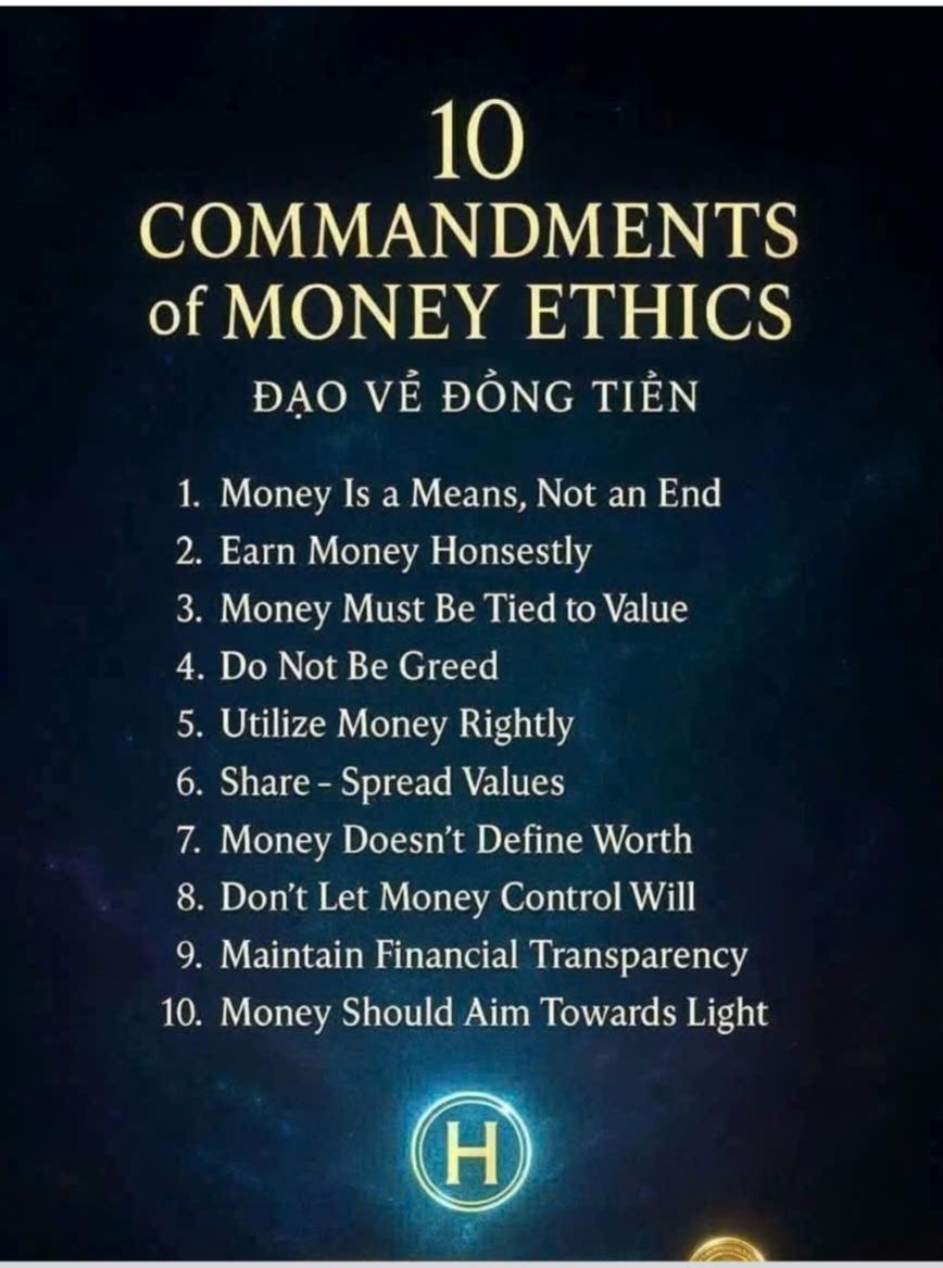 Sử dụng đồng tiền để kiến tạo một xã hội công bằng, phát triển bền vững và mang lại lợi ích cho muôn loài.HCOIN 27-10 10 ĐIỀU RĂN ĐẠO VỀ ĐỒNG TIỀN 1. Tiền Là Phương Tiện, Không Phải Mục Đích: Hãy coi tiền như công cụ phục vụ cuộc sống chứ không biến nó thành mục tiêu tối thượng. 2. Kiếm Tiền Chân Chính: Chỉ tạo ra của cải từ công sức, trí tuệ và con đường hợp pháp, không lừa dối hay gian trá. 3. Tiền Phải Gắn Với Giá Trị: Mỗi đồng tiền tạo ra nên đi kèm với giá trị thật cho xã hội và cộng đồng. 4. Không Tham Lam Vô Độ: Biết đủ là đủ, không để lòng tham cuốn vào vòng xoáy vô tận. 5. Sử Dụng Tiền Đúng Mục Đích: Chi tiêu, đầu tư một cách khôn ngoan và đạo đức, tránh phung phí hoặc sử dụng cho mục đích hủy hoại. 6. Chia Sẻ – Lan Tỏa Giá Trị: Dành một phần tài sản để giúp đỡ cộng đồng, phát triển giáo dục và hỗ trợ người yếu thế. 7. Tiền Không Định Giá Nhân Phẩm: Đừng đánh giá con người qua số tiền họ sở hữu mà qua giá trị tinh thần và đạo đức. 8. Không Để Tiền Sai Khiến Ý Chí: Tiền phải phục vụ con người; không để đồng tiền điều khiển lối sống và quyết định đạo đức. 9. Gìn Giữ Tài Chính Minh Bạch: Quản lý tài sản rõ ràng, minh bạch để xây dựng lòng tin và trách nhiệm. 10. Tiền Phải Hướng Tới Ánh Sáng: Sử dụng đồng tiền để kiến tạo một xã hội công bằng, phát triển bền vững và mang lại lợi ích cho muôn loài.0 Comments 0 Shares5