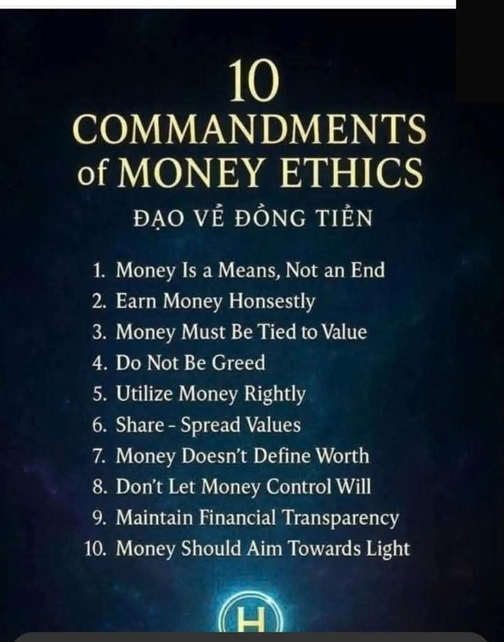 HCOIN 27-10 10 ĐIỀU RĂN ĐẠO VỀ ĐỒNG TIỀN 1. Tiền Là Phương Tiện, Không Phải Mục Đích: Hãy coi tiền như công cụ phục vụ cuộc sống chứ không biến nó thành mục tiêu tối thượng. 2. Kiếm Tiền Chân Chính: Chỉ tạo ra của cải từ công sức, trí tuệ và con đường hợp pháp, không lừa dối hay gian trá. 3. Tiền Phải Gắn Với Giá Trị: Mỗi đồng tiền tạo ra nên đi kèm với giá trị thật cho xã hội và cộng đồng. 4. Không Tham Lam Vô Độ: Biết đủ là đủ, không để lòng tham cuốn vào vòng xoáy vô tận. 5. Sử Dụng Tiền Đúng Mục Đích: Chi tiêu, đầu tư một cách khôn ngoan và đạo đức, tránh phung phí hoặc sử dụng cho mục đích hủy hoại. 6. Chia Sẻ – Lan Tỏa Giá Trị: Dành một phần tài sản để giúp đỡ cộng đồng, phát triển giáo dục và hỗ trợ người yếu thế. 7. Tiền Không Định Giá Nhân Phẩm: Đừng đánh giá con người qua số tiền họ sở hữu mà qua giá trị tinh thần và đạo đức. 8. Không Để Tiền Sai Khiến Ý Chí: Tiền phải phục vụ con người; không để đồng tiền điều khiển lối sống và quyết định đạo đức. 9. Gìn Giữ Tài Chính Minh Bạch: Quản lý tài sản rõ ràng, minh bạch để xây dựng lòng tin và trách nhiệm. 10. Tiền Phải Hướng Tới Ánh Sáng: Sử dụng đồng tiền để kiến tạo một xã hội công bằng, phát triển bền vững và mang lại lợi ích cho muôn loài. Đọc thêm Đọc thêm  Đọc thêm