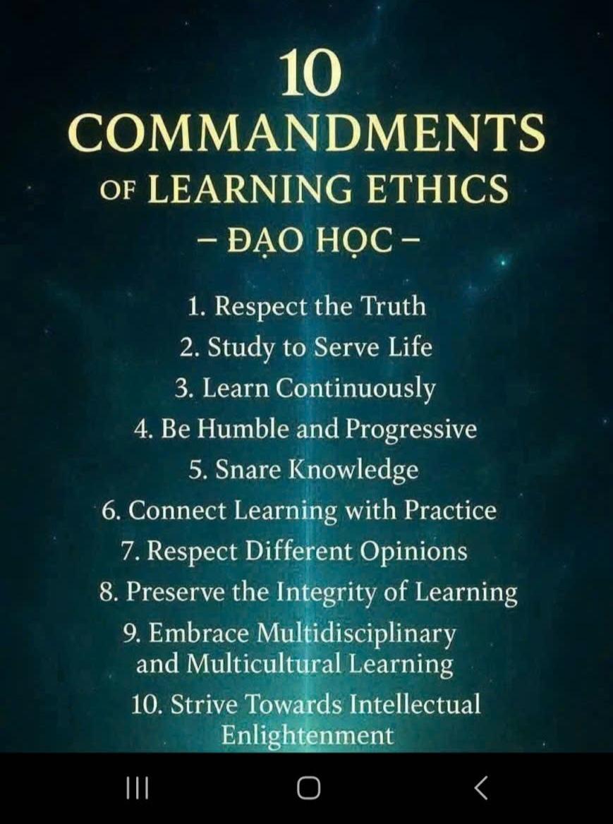 HNI 28/10: 10 ĐIỀU RĂN VỀ ĐẠO HỌC 1. Tôn Trọng Sự Thật: Học tập để tìm ra sự thật, không bóp méo hay che giấu tri thức. 2. Học Để Phục Vụ Cuộc Sống: Tri thức không phải chỉ để tích lũy mà phải ứng dụng để cải thiện đời sống con người và xã hội. 3. Liên Tục Học Hỏi: Đạo học là hành trình suốt đời, không bao giờ có điểm dừng. 4. Khiêm Tốn & Cầu Tiến: Càng học càng biết mình nhỏ bé; giữ thái độ khiêm nhường và khát khao khám phá không ngừng. 5. Chia Sẻ Tri Thức: Kiến thức không thuộc riêng ai; hãy chia sẻ để cùng nâng cao tầm trí tuệ nhân loại. 6. Học Gắn Liền Với Hành: Không chỉ học lý thuyết suông mà phải hành động để biến tri thức thành sức mạnh thực tế. 7. Tôn Trọng Ý Kiến Khác Biệt: Tranh luận trong tinh thần xây dựng và cởi mở, không độc đoán hay bảo thủ. 8. Giữ Gìn Sự Trong Sáng Của Đạo Học: Không lợi dụng tri thức để phục vụ mục đích xấu hoặc gây hại cho cộng đồng. 9. Kết Nối Đa Ngành – Đa Văn Hóa: Mở rộng học hỏi từ nhiều lĩnh vực và nền văn hóa để xây dựng một hệ tri thức toàn diện. 10. Hướng Đến Ánh Sáng Trí Tuệ: Đặt mục tiêu cao nhất là giúp con người tiến hóa về trí tuệ và tinh thần, góp phần kiến tạo thế giới khai sáng.