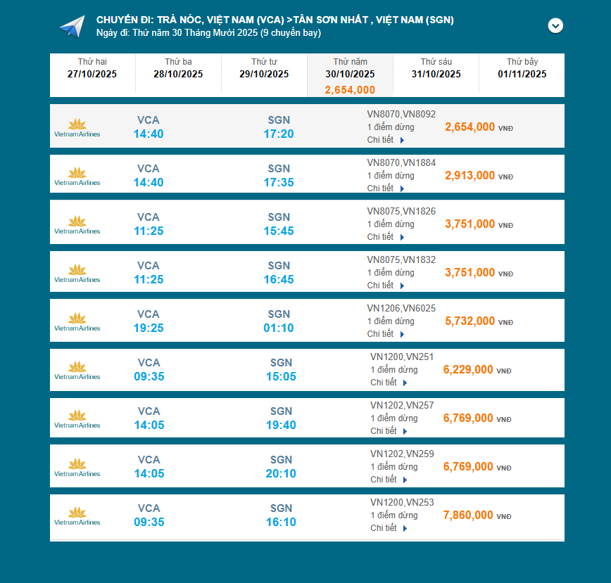 • Trà Nóc (VCA) - Tân Sơn Nhất (SGN) 30/10/2025