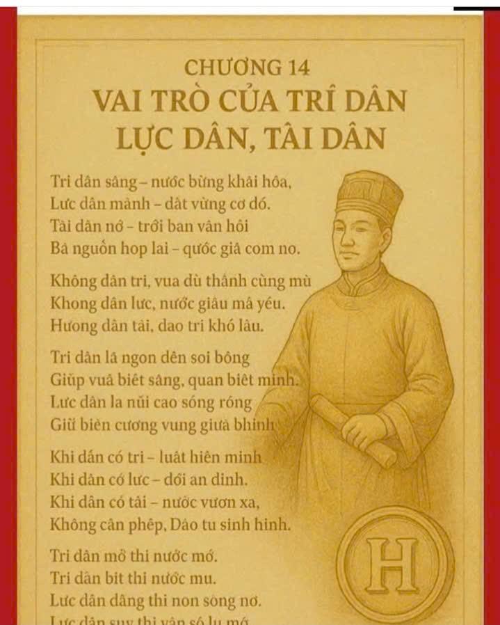 HNI 28/10 Bài thơ Chương 14: Vai trò của trí dân, lực dân, tài dân (Thơ: Henry Lê – Lê Đình Hải) Trí dân sáng – nước bừng khai hóa, Lực dân mạnh – đất vững cơ đồ. Tài dân nở – trời ban vận hội, Ba nguồn hợp lại – quốc gia cơm no. Không dân trí, vua dù thánh cũng mù, Không dân lực, nước giàu mà yếu. Không dân tài, đạo trị khó lâu, Bởi nhân tâm là ngọc quý diệu. Trí dân là ngọn đèn soi bóng, Giúp vua biết sáng, quan biết minh. Lực dân là núi cao sông rộng, Giữ biên cương vững giữa thịnh bình. Tài dân là kho báu vô tận, Ẩn trong người thợ, kẻ nông phu. Trong tiếng hát, trong tay cần mẫn, Trong giọt mồ hôi chảy giữa sương thu. Khi dân có trí – luật hiền minh, Khi dân có lực – đời an định. Khi dân có tài – nước vươn xa, Không cần phép, Đạo tự sinh hình. Triều đại nào xem dân là cội, Sẽ thịnh muôn đời chẳng phôi pha. Triều đại nào quên dân trí tuệ, Sẽ tàn như lá cuối mùa hoa. Trí dân mở thì nước mở, Trí dân bịt thì nước mù. Lực dân dâng thì non sông nở, Lực dân suy thì vận số lu mờ. Tài dân chẳng ở cung vàng, Mà trong đồng ruộng, trong làng nhỏ bé. Biết gom từng tia sáng nhỏ, Thì quốc gia rạng tựa mặt trời kia. Dân là thầy của mọi triều đại, Là linh hồn của mọi văn minh. Không có dân, vua chỉ là tượng, Không có dân, nước hóa hư danh. Muốn hưng thịnh – hãy khơi dân trí, Muốn vững bền – hãy dưỡng dân tâm. Muốn trường tồn – hãy tin dân lực, Bởi dân là Trời, là Đạo, là Nguồn. Đọc thêm