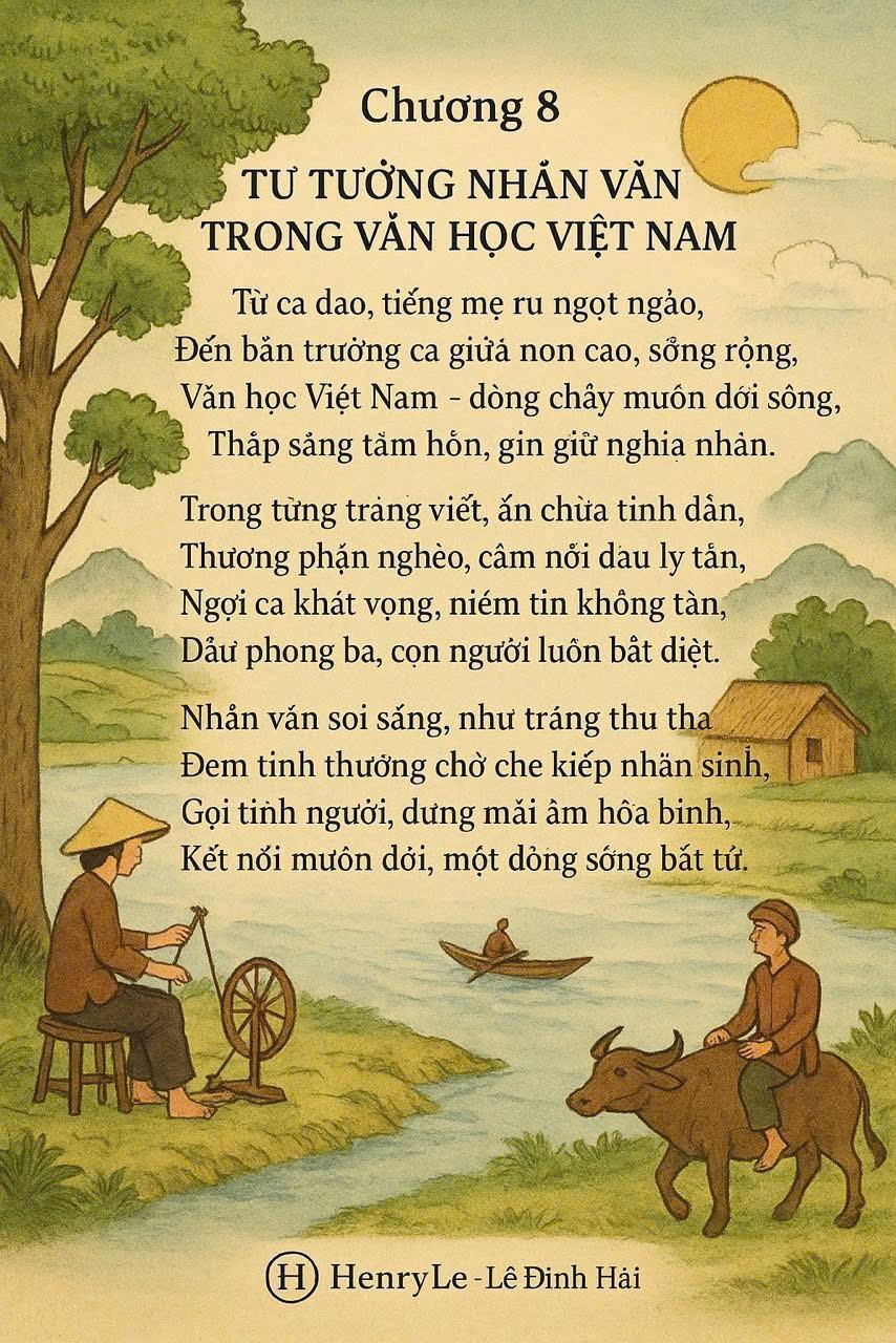 HNI 28/10 📕BÀI THƠ CHƯƠNG 8: TƯ TƯỞNG NHÂN VĂN TRONG VĂN HỌC VIỆT NAM Từ ca dao, tiếng mẹ ru ngọt ngào, Đến bản trường ca giữa non cao, sông rộng, Văn học Việt Nam – dòng chảy muôn đời sống, Thắp sáng tâm hồn, gìn giữ nghĩa nhân. Trong từng trang viết, ẩn chứa tình dân, Thương phận nghèo, cảm nỗi đau ly tán, Ngợi ca khát vọng, niềm tin không tàn, Dẫu phong ba, con người luôn bất diệt. Nhân văn soi sáng, như trăng thu tha thiết, Đem tình thương chở che kiếp nhân sinh, Gọi tình người, dựng mái ấm hòa bình, Kết nối muôn đời, một dòng sông bất tử. Văn học Việt – ngọn lửa bền bỉ, Thắp trong tim ánh sáng của ngày mai, Khẳng định con người – giá trị muôn loài, Bức tranh nhân văn, rạng ngời đất Việt.