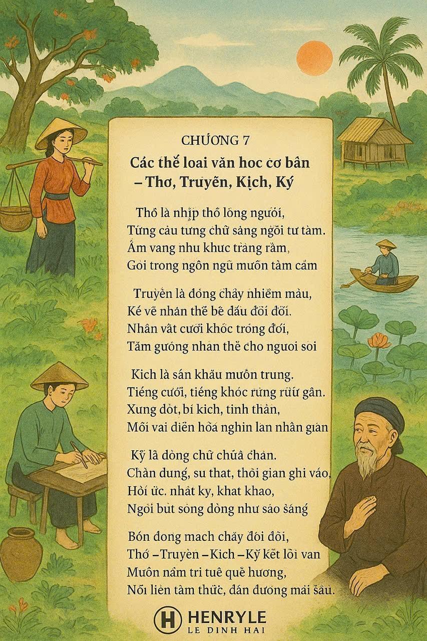 HNI 28/10 CHƯƠNG 7: CÁC THỂ LOẠI VĂN HỌC CƠ BẢN – THƠ, TRUYỆN, KỊCH, KÝ Thơ là nhịp thở lòng người, Từng câu từng chữ sáng ngời tự tâm. Âm vang như khúc trăng rằm, Gói trong ngôn ngữ muôn tầm cảm sâu. Truyện là dòng chảy nhiệm mầu, Kể về nhân thế bể dâu đổi dời. Nhân vật cười khóc trong đời, Tấm gương nhân thế cho người soi chung. Kịch là sân khấu muôn trùng, Tiếng cười, tiếng khóc rưng rưng thật gần. Xung đột, bi kịch, tình thân, Mỗi vai diễn hóa nghìn lần nhân gian. Ký là dòng chữ chứa chan, Chân dung, sự thật, thời gian ghi vào. Hồi ức, nhật ký, khát khao, Ngòi bút sống động như sao sáng ngời. Bốn dòng mạch chảy đời đời, Thơ – Truyện – Kịch – Ký kết lời văn chương. Muôn năm trí tuệ quê hương, Nối liền tâm thức, dẫn đường mai sau.