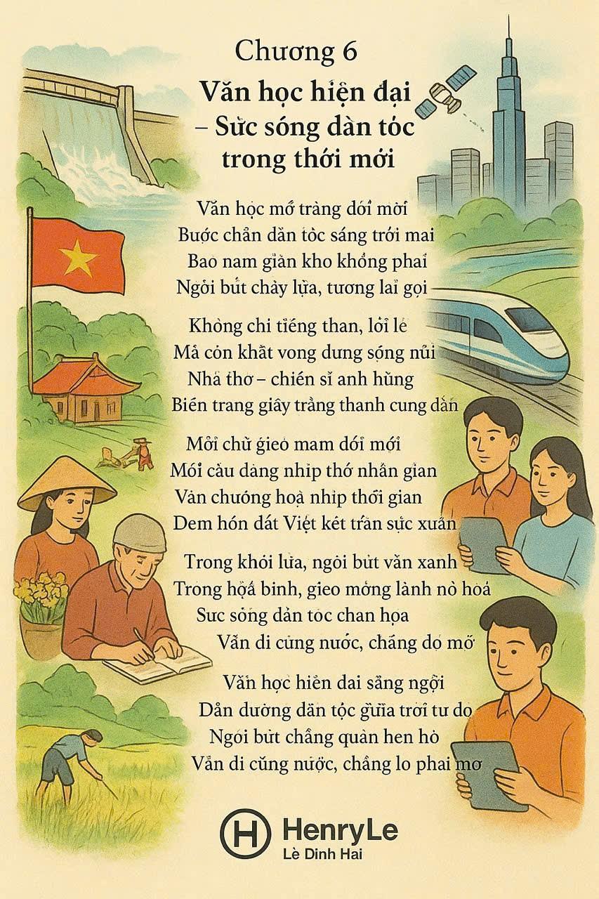 HNI. 28/10 💥CHƯƠNG 9: ẢNH HƯỞNG VĂN HỌC THẾ GIỚI ĐỐI VỚI VIỆT NAM Từ thuở xưa, tiếng sóng ngoài khơi xa, Mang trang sách từ muôn miền đất lạ, Bước chân người, mở giao lưu văn hóa, Đem tinh hoa về góp nhịp sông Hồng. Văn học thế giới – ngọn gió mênh mông, Tỏa hương sáng vào hồn thơ đất Việt, Từ triết học Đông – Tây chan hòa, bất diệt, Đến khúc ca nhân bản, tự do. Những bản trường ca Hy Lạp, La Mã, Ngợi ca người hùng, ý chí kiên cường, Đã gieo vào lòng dân tộc quê hương, Khát vọng đứng lên, làm chủ vận mệnh. Ánh sáng nhân văn từ văn chương Âu Mỹ, Thắp ngọn đèn dân chủ, tự do, Khơi dậy niềm tin, chống lại ngoại xâm, Viết bản anh hùng ca bất tận. Từ thi ca Trung Hoa mộng mị, Đến truyện Kiều nâng tầm văn chương, Từ triết lý Phật giáo, Nho gia, Đến tư tưởng nhân quyền của nhân loại. Văn học Việt Nam – dòng sông tiếp nhận, Nhưng chẳng bao giờ mất gốc nguồn thiêng, Biết chắt lọc, biến thành sức mạnh riêng, Dung hợp bốn phương thành bản sắc Việt. Ảnh hưởng thế giới, là dòng suối ngọt, Nuôi tâm hồn, mở trí tuệ con dân, Để văn học Việt Nam tỏa sáng muôn lần, Sánh vai cùng nhân loại – rực rỡ.