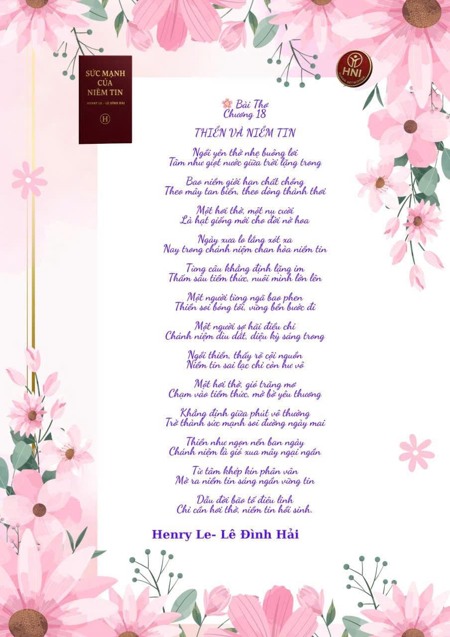 HNI 28/10 🌸 Bài Thơ Chương 18- THIỀN VÀ NIỀM TIN Ngồi yên thở nhẹ buông lơi Tâm như giọt nước giữa trời lặng trong Bao niềm giới hạn chất chồng Theo mây tan biến, theo dòng thảnh thơi Một hơi thở, một nụ cười Là hạt giống mới cho đời nở hoa Ngày xưa lo lắng xót xa Nay trong chánh niệm chan hòa niềm tin Từng câu khẳng định lặng im Thấm sâu tiềm thức, nuôi mình lớn lên Một người từng ngã bao phen Thiền soi bóng tối, vững bền bước đi Một người sợ hãi điều chi Chánh niệm dìu dắt, diệu kỳ sáng trong Ngồi thiền, thấy rõ cội nguồn Niềm tin sai lạc chỉ còn hư vô Một hơi thở, gió trăng mơ Chạm vào tiềm thức, mở bờ yêu thương Khẳng định giữa phút vô thường Trở thành sức mạnh soi đường ngày mai Thiền như ngọn nến ban ngày Chánh niệm là gió xua mây ngại ngần Từ tâm khép kín phân vân Mở ra niềm tin sáng ngần vững tin Dẫu đời bão tố điêu linh Chỉ cần hơi thở, niềm tin hồi sinh.