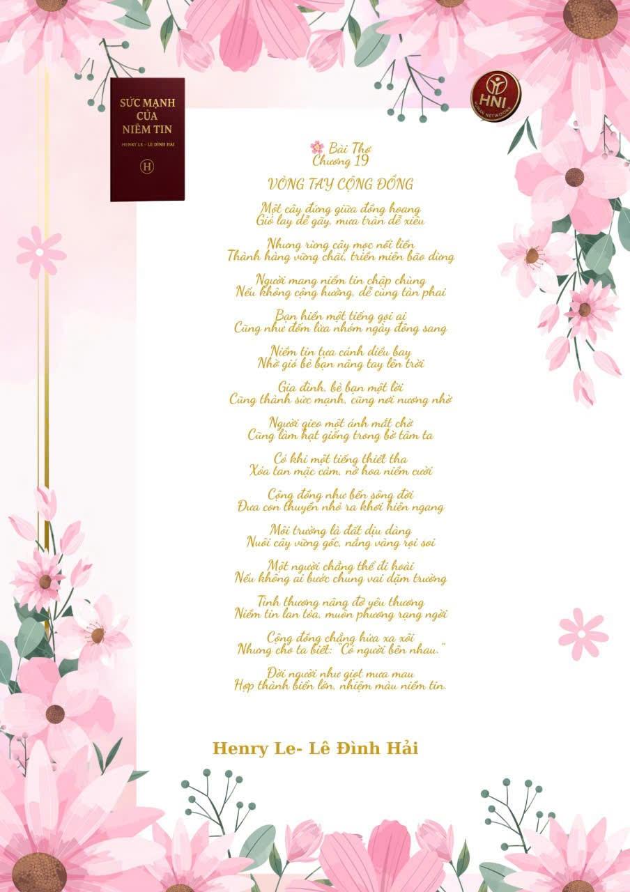 HNI 28/10 🌸 Bài Thơ Chương 19 - VÒNG TAY CỘNG ĐỒNG Một cây đứng giữa đồng hoang Gió lay dễ gãy, mưa tràn dễ xiêu Nhưng rừng cây mọc nối liền Thành hàng vững chãi, triền miên bão dừng Người mang niềm tin chập chùng Nếu không cộng hưởng, dễ cùng tàn phai Bạn hiền một tiếng gọi ai Cũng như đốm lửa nhóm ngày đông sang Niềm tin tựa cánh diều bay Nhờ gió bè bạn nâng tay lên trời Gia đình, bè bạn một lời Cũng thành sức mạnh, cũng nơi nương nhờ Người gieo một ánh mắt chờ Cũng làm hạt giống trong bờ tâm ta Có khi một tiếng thiết tha Xóa tan mặc cảm, nở hoa niềm cười Cộng đồng như bến sông đời Đưa con thuyền nhỏ ra khơi hiên ngang Môi trường là đất dịu dàng Nuôi cây vững gốc, nắng vàng rọi soi Một người chẳng thể đi hoài Nếu không ai bước chung vai dặm trường Tình thương nâng đỡ yêu thương Niềm tin lan tỏa, muôn phương rạng ngời Cộng đồng chẳng hứa xa xôi Nhưng cho ta biết: “Có người bên nhau.” Đời người như giọt mưa mau Hợp thành biển lớn, nhiệm màu niềm tin.