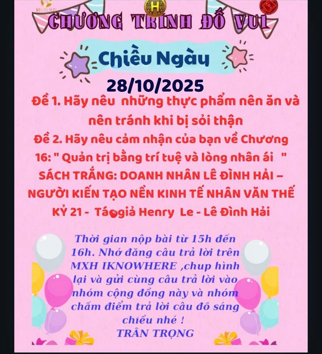 CÂU ĐỐ BUỔI CHIỀU NGÀY 28.10 🏻ĐỀ 1: Những thực phẩm nên ăn và nên tránh khi bị sỏi thận 1. Thực phẩm nên ăn: Khi bị sỏi thận, người bệnh cần chọn thực phẩm giúp làm loãng nước tiểu, ngăn kết tinh sỏi mới và hỗ trợ đào thải sỏi. Dưới đây là một số nhóm thực phẩm nên dùng: 1. Uống nhiều nước: Giúp thải độc, giảm cô đặc nước tiểu, hạn chế tạo sỏi. 2. Trái cây giàu vitamin C như cam, chanh, bưởi: Giúp tăng cường sức đề kháng và hòa tan sỏi nhẹ. 3. Rau xanh ít oxalat như cải bó xôi, bắp cải, bí đỏ, mướp hương. 4. Ngũ cốc nguyên hạt, gạo lứt, yến mạch: Cung cấp chất xơ và dưỡng chất tốt cho thận. 5. Cá, thịt trắng (gà, cá hồi, cá thu): Dễ tiêu hóa, ít purin hơn thịt đỏ. 6. Thực phẩm chứa magie và kali như chuối, khoai lang, bơ: Giúp cân bằng khoáng chất trong thận. 7. Dầu ô liu, dầu mè: Tốt cho hệ tim mạch và thận. 2. Thực phẩm nên tránh: 1. Thịt đỏ (bò, cừu, heo): Giàu purin, dễ làm tăng acid uric và hình thành sỏi. 2. Thực phẩm chứa nhiều oxalat như rau chân vịt, cải bó xôi, củ dền, sô-cô-la, cà phê, trà đặc. 3. Muối, nước mắm, đồ mặn: Làm tăng áp lực cho thận, dễ tạo sỏi canxi. 4. Đồ chiên rán, nhiều dầu mỡ: Gây rối loạn chuyển hóa, ảnh hưởng chức năng thận. 5. Nước ngọt có gas, bia, rượu: Làm mất cân bằng điện giải và tăng nguy cơ sỏi. 6. Đạm động vật quá nhiều: Tăng bài tiết canxi, acid uric trong nước tiểu. 7. Thực phẩm chế biến sẵn: Có nhiều chất bảo quản, natri và phosphat gây hại cho thận. Tóm lại: Người bị sỏi thận nên ăn nhạt, uống nhiều nước, ưu tiên rau củ quả tươi, hạn chế thịt đỏ và thực phẩm nhiều muối để giúp thận khỏe mạnh, ngăn sỏi tái phát. 🏻ĐỀ 2: Cảm nhận về Chương 16 – “Quản trị bằng trí tuệ và lòng nhân ái” (Sách Trắng: Doanh nhân Lê Đình Hải – Người kiến tạo nền kinh tế nhân văn thế kỷ 21)** Chương 16 mang đến cho tôi một bài học sâu sắc về nghệ thuật lãnh đạo nhân văn, nơi trí tuệ và lòng nhân ái không tách rời mà song hành cùng nhau để kiến tạo giá trị bền vững. Doanh nhân Lê Đình Hải không chỉ nói về quản trị bằng lý trí hay kỹ năng, mà ông đặt trái tim con người vào trung tâm mọi quyết định. Ông cho thấy rằng một tổ chức chỉ thực sự mạnh khi mỗi thành viên đều được thấu hiểu, yêu thương và phát triển.“Trí tuệ” giúp người lãnh đạo nhìn xa, đưa ra chiến lược đúng đắn. “Nhân ái” giúp họ cảm hóa con người, tạo môi trường gắn kết, lan tỏa năng lượng tích cực. Khi hai yếu tố này kết hợp, doanh nghiệp không chỉ tạo ra lợi nhuận, mà còn kiến tạo giá trị cho xã hội. Tôi cảm nhận được tinh thần “lãnh đạo phụng sự” trong chương này – nơi người đứng đầu không thống trị, mà dẫn dắt bằng đức, trí và tâm. Chính điều đó đã làm nên tầm vóc của Chủ tịch Lê Đình Hải – người tiên phong trong nền kinh tế nhân văn, lấy con người làm gốc, lấy yêu thương làm nền. Chương 16 là lời nhắc nhở mỗi chúng ta – dù là nhà lãnh đạo hay nhân viên – hãy sống và làm việc bằng trí tuệ sáng suốt và trái tim nhân hậu. Bởi chính sự kết hợp đó sẽ tạo nên thành công bền vững và giá trị nhân văn đích thực.