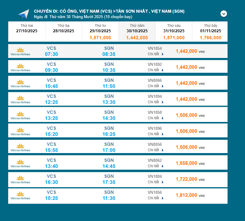 Cỏ Ống (VCS) - Tân Sơn Nhất (SGN) 30/10/2025 Vietnam Airlines VN8066 10:45 vé máy bay 1.442.000 Vietnam Airlines VN1854 07:30 vé máy bay 1.506.000 Vietnam Airlines VN1892 09:30 vé máy bay 1.506.000 Vietnam Airlines VN1894 12:25 vé máy bay 1.506.000 Vietnam Airlines VN1858 13:25 vé máy bay 1.506.000 Vietnam Airlines VN1896 15:20 vé máy bay 1.506.000 Vietnam Airlines VN8056 15:55 vé máy bay 1.582.000 Vietnam Airlines VN8062 13:40 vé máy bay 1.658.000 Vietnam Airlines VN1884 16:30 vé máy bay 1.766.000 Vietnam Airlines VN1856 10:25 vé máy bay 1.817.000 đã bao gốm thuế phí Liên hệ: 0925642617 - 0964507862 - (0886912037 số này có zalo