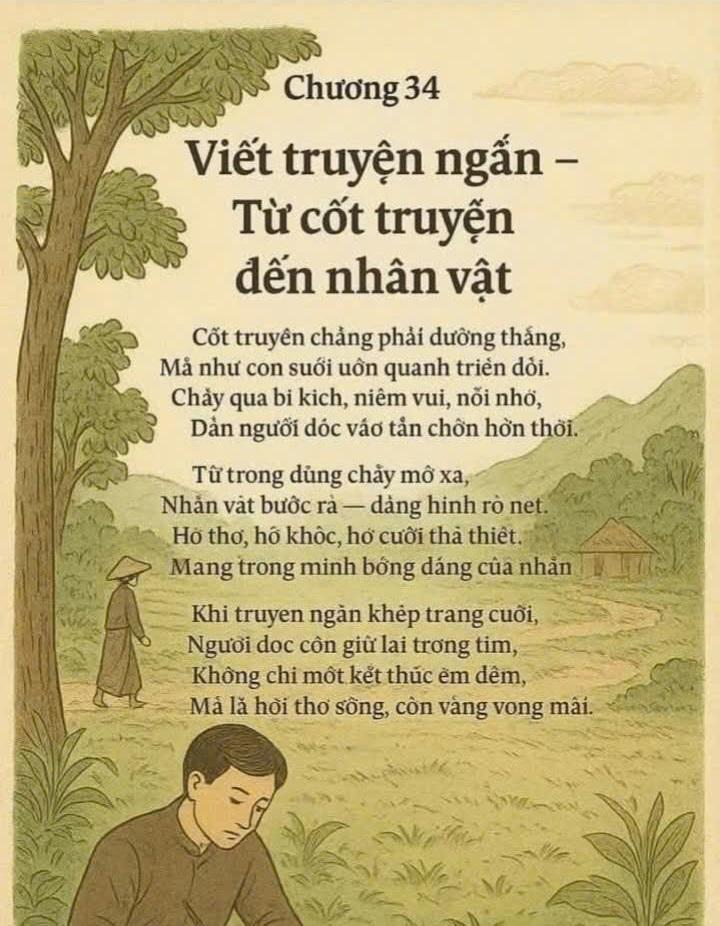 HNI 30/10 - CHƯƠNG 34 : VIẾT TRUYỆN NGẮN – TỪ CỐT TRUYỆN ĐẾN NHÂN VẬT Một mầm ý tưởng nhỏ nhoi, Len trong tâm trí, gọi mời bước chân. Nó hóa thành sợi chỉ mảnh ngần, Dệt thành cốt truyện, nhịp dần hiện ra. Cốt truyện chẳng phải đường thẳng, Mà như con suối uốn quanh triền đồi. Chảy qua bi kịch, niềm vui, nỗi nhớ, Dẫn người đọc vào tận chốn hồn thôi. Từ trong dòng chảy mờ xa, Nhân vật bước ra — dáng hình rõ nét. Họ thở, họ khóc, họ cười tha thiết, Mang trong mình bóng dáng của nhân gian. Nhân vật chính chẳng phải anh hùng, Có khi chỉ là kẻ lặng thầm vô danh. Nhưng chính họ, trong bước chân đời thường, Đã làm sáng cả bức tranh nhân thế. Khi truyện ngắn khép trang cuối, Người đọc còn giữ lại trong tim, Không chỉ một kết thúc êm đềm, Mà là hơi thở sống, còn vang vọng mãi.