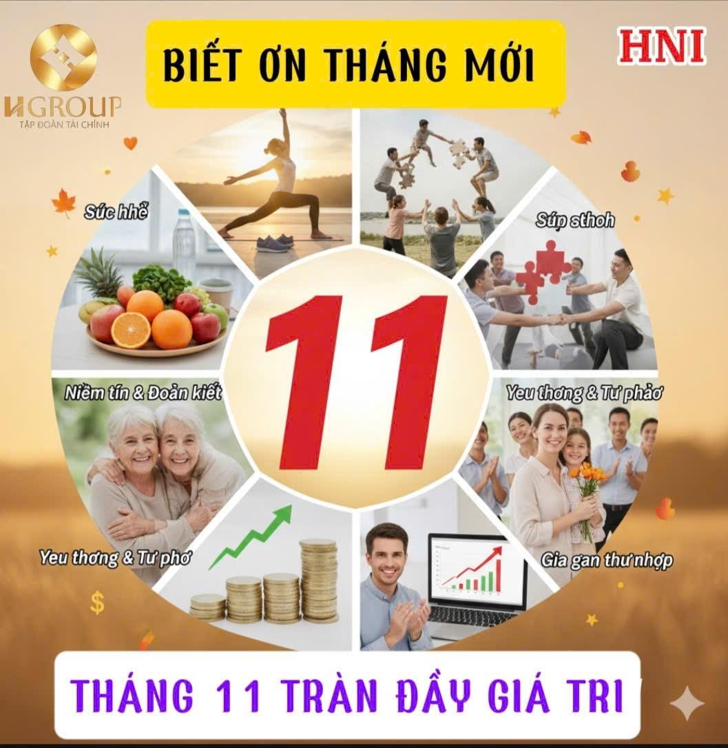 HNI 1/11 BIẾT ƠN THÁNG MỚI – THÁNG 11 TRÀN ĐẦY GIÁ TRỊ Tháng 11 ghé đến mang theo hơi thở của mùa cuối năm – thời khắc để mỗi chúng ta dừng lại, cảm nhận và biết ơn những điều tốt đẹp đang hiện hữu. Biết ơn tháng mới 11 vì đã trao cho chúng ta cơ hội làm mới bản thân, kiến tạo thêm nhiều giá trị về sức khỏe, niềm tin, đoàn kết, yêu thương, tự hào và cả sự gia tăng thu nhập. Trước hết, tháng 11 là lời nhắc nhở về sức khỏe – nền tảng của mọi hạnh phúc và thành công. Khi ta chăm sóc cơ thể bằng chế độ sống lành mạnh, luyện tập thể thao, giữ tinh thần tích cực, ta đang tạo nên năng lượng dồi dào để đón nhận những cơ hội mới. Tháng 11 cũng là tháng của niềm tin và đoàn kết. Khi cùng nhau hướng về mục tiêu chung, chúng ta không chỉ gắn bó hơn mà còn nhân lên sức mạnh tập thể. Mỗi cá nhân tin tưởng, đồng lòng, sẽ tạo nên những bước tiến vững chắc và đầy ý nghĩa. Đặc biệt, tháng 11 còn là thời gian để yêu thương và tự hào. Yêu thương giúp trái tim ấm áp hơn, lan tỏa năng lượng tích cực đến mọi người xung quanh. Tự hào vì những nỗ lực, thành quả đã đạt được – dù lớn hay nhỏ – đều xứng đáng được trân trọng. Và khi sức khỏe, niềm tin, đoàn kết, yêu thương cùng song hành, giá trị vật chất và thu nhập cũng tự nhiên tăng trưởng. Bởi khi ta làm việc với trái tim biết ơn và tinh thần tích cực, thành công sẽ đến một cách bền vững và xứng đáng. Biết ơn tháng 11 – tháng mới, khởi đầu mới, và hành trình tạo ra thật nhiều giá trị tốt đẹp cho chính mình và cho cộng đồng!