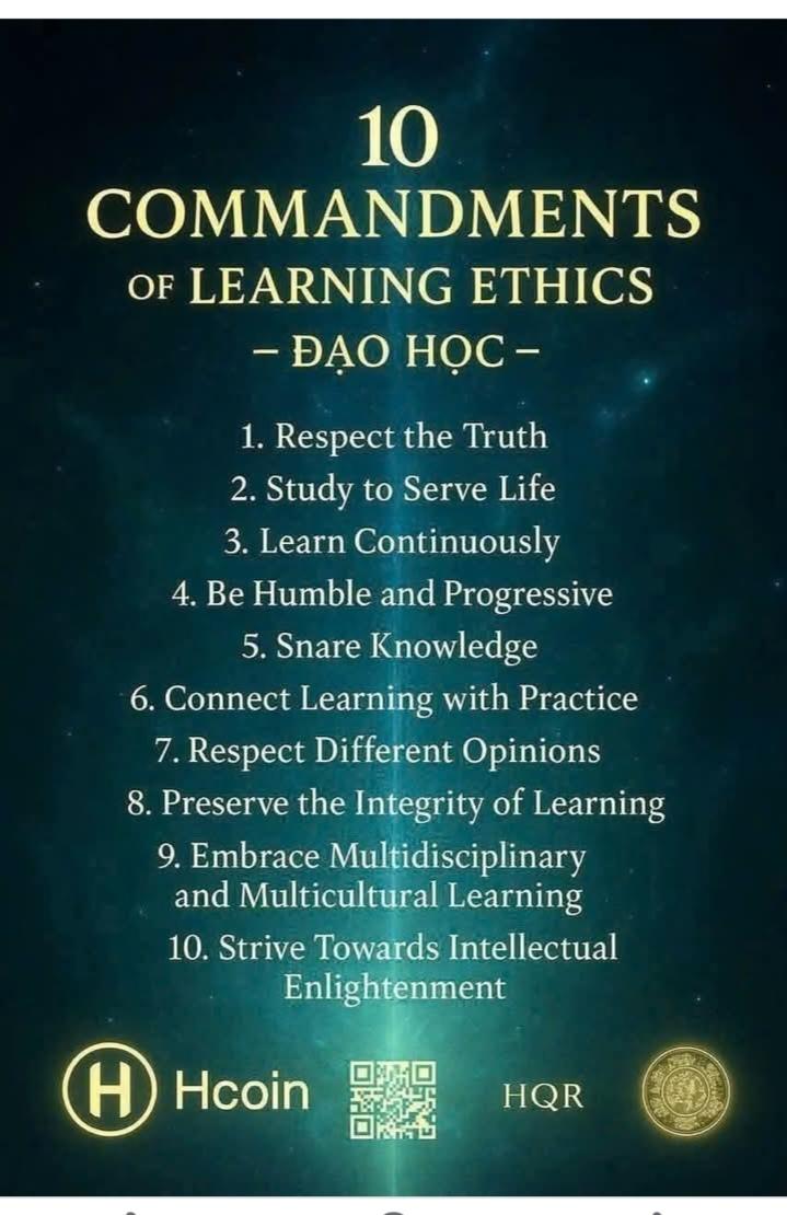 HNI 31-10 - B15. 10 ĐIỀU RĂN VỀ ĐẠO HỌC 1. Tôn Trọng Sự Thật: Học tập để tìm ra sự thật, không bóp méo hay che giấu tri thức. 2. Học Để Phục Vụ Cuộc Sống: Tri thức không phải chỉ để tích lũy mà phải ứng dụng để cải thiện đời sống con người và xã hội. 3. Liên Tục Học Hỏi: Đạo học là hành trình suốt đời, không bao giờ có điểm dừng. 4. Khiêm Tốn & Cầu Tiến: Càng học càng biết mình nhỏ bé; giữ thái độ khiêm nhường và khát khao khám phá không ngừng. 5. Chia Sẻ Tri Thức: Kiến thức không thuộc riêng ai; hãy chia sẻ để cùng nâng cao tầm trí tuệ nhân loại. 6. Học Gắn Liền Với Hành: Không chỉ học lý thuyết suông mà phải hành động để biến tri thức thành sức mạnh thực tế. 7. Tôn Trọng Ý Kiến Khác Biệt: Tranh luận trong tinh thần xây dựng và cởi mở, không độc đoán hay bảo thủ. 8. Giữ Gìn Sự Trong Sáng Của Đạo Học: Không lợi dụng tri thức để phục vụ mục đích xấu hoặc gây hại cho cộng đồng. 9. Kết Nối Đa Ngành – Đa Văn Hóa: Mở rộng học hỏi từ nhiều lĩnh vực và nền văn hóa để xây dựng một hệ tri thức toàn diện. 10. Hướng Đến Ánh Sáng Trí Tuệ: Đặt mục tiêu cao nhất là giúp con người tiến hóa về trí tuệ và tinh thần, góp phần kiến tạo thế giới khai sáng. Đọc thêm