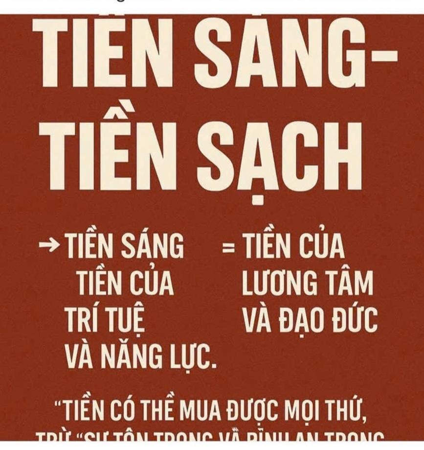 HNI 1/11: “TIỀN SÁNG – TIỀN SẠCH” Tiền không xấu. Xấu là cách người ta kiếm tiền và xài tiền. Có người bán rẻ nhân cách để mua sự giàu sang. Cũng có người dùng trí tuệ và tử tế để đổi lấy tự do. 👉 “Tiền sáng” là tiền của trí tuệ và năng lực. 👉 “Tiền sạch” là tiền của lương tâm và đạo đức. Tiền sáng giúp ta ngẩng cao đầu. Tiền sạch giúp ta ngủ yên giấc. Làm giàu không khó, Giữ nhân cách khi giàu mới khó. Thà chậm hơn một chút, nhưng đi bằng con đường sáng và sạch. Bởi vì — > Tiền có thể mua được mọi thứ, trừ “sự tôn trọng và bình an trong tim”. #TiềnSángTiềnSạch #TưDuyLàmGiàuĐúngNghĩa #GiàuCảTâmLẫnTầm #MarketingĐạoĐức #ChơiĐỉnhSốngĐẹp