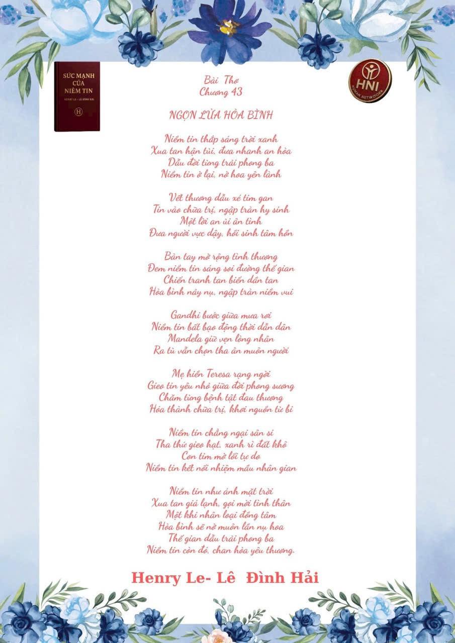 HNI 3-11- B10 💥💥 BÀI THƠ CHƯƠNG 42 :- ÁNH SÁNG NIỀM TIN Niềm tin thắp ngọn lửa hồng Lan ra cộng khắp trong lòng nhân gian Từ tim nhỏ bé chứa chan Đem gieo hạt sáng, ngập tràn yêu thương Một lời động viên dịu dàng Hóa thành sức mạnh, mở đường mai sau Một cành hoa nở nhiệm màu Mang niềm hy vọng, dệt câu an hòa Niềm tin như ánh trăng ngà Xua đi bóng tối, chan hòa niềm vui Một bàn tay nắm tay người Cộng đồng bừng sáng, ngát mùi tình thân Trong gian khó, chẳng ngại ngần Niềm tin nối bước, kết vần nghĩa nhân Cười trong giông bão gian truân Tin rằng phía trước muôn phần sáng tươi Mỗi người gieo hạt nụ cười Một ngày trăm vạn mặt trời bừng lên Niềm tin chẳng ở đâu xa Từ tim, từ mắt, từ ta, từ người Tình thương chảy khắp đất trời Gắn liền nhân loại, rạng ngời ngày mai Niềm tin – dòng suối trong ngần Nuôi hồn thế giới, muôn phần nở hoa